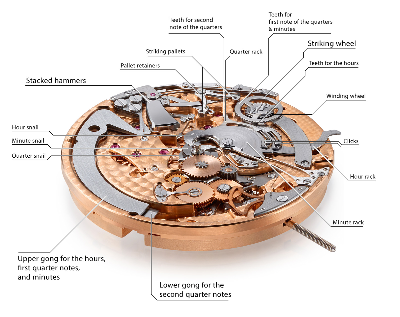 The hammers in the Répétition Souveraine are arranged in a stack, as are the gongs, with one placed directly above the other and connected to their respective pallets (Image: Revolution ©)