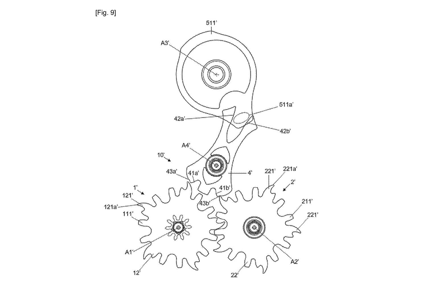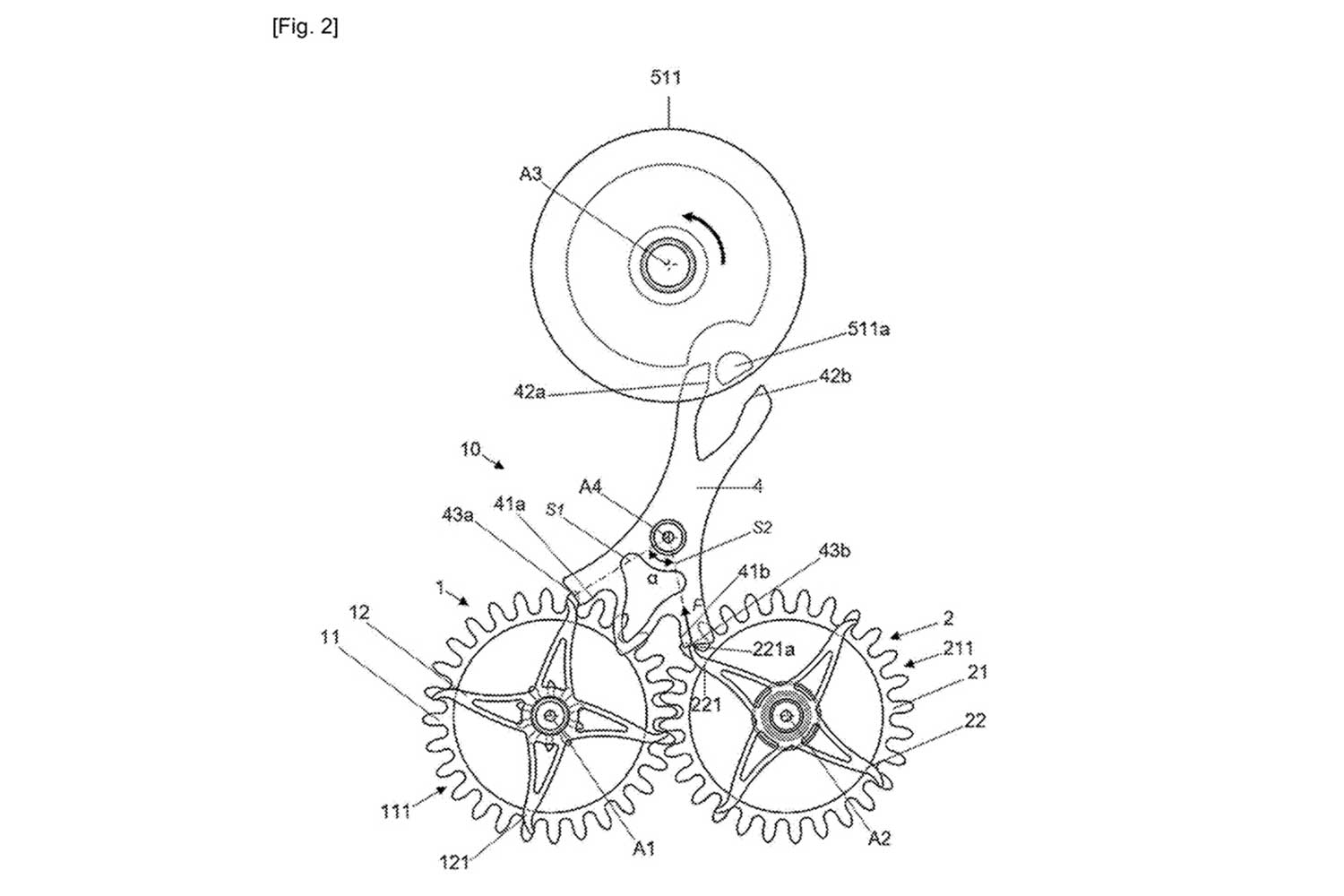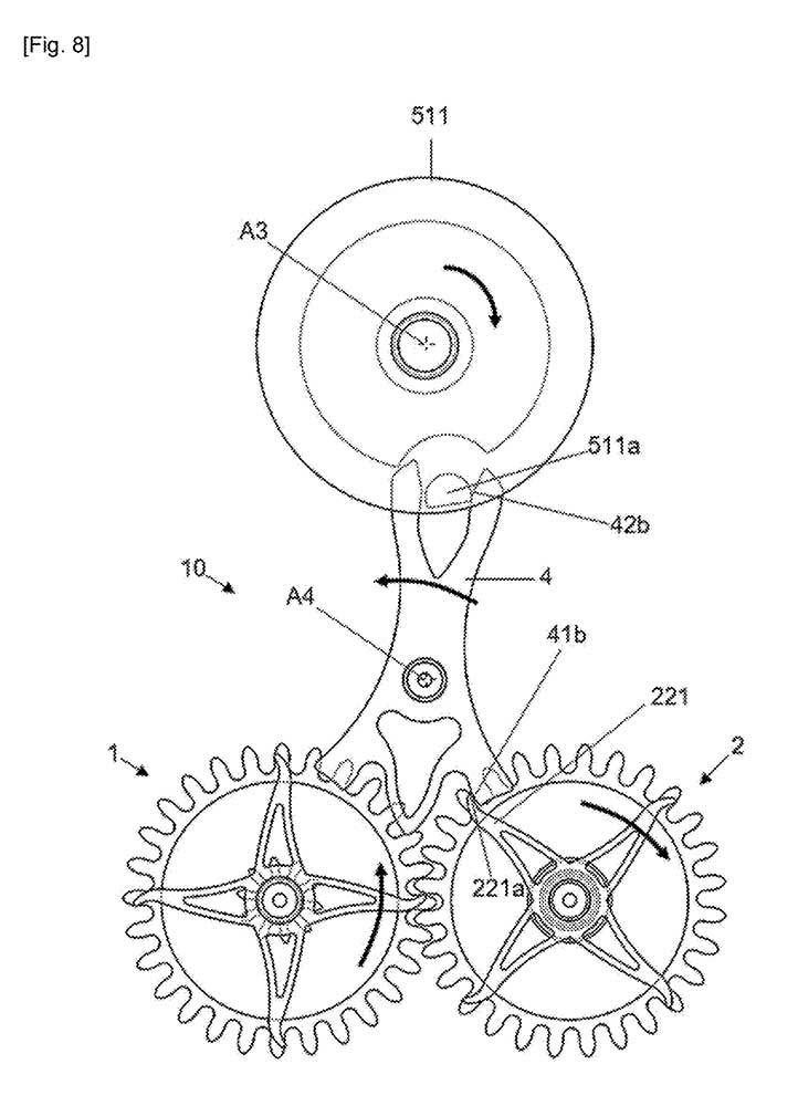 In the first configuration, the design mirrors Breguet’s original concept, in which the locking teeth and drive toothing are on separate planes. Attached to each escape wheel is a four-armed component (121, 221) with elongated, curved profiles terminating in rounded tips (121a, 221a) that engage with the locking surface (43a, 42b) of the lever. These serve as locking teeth, halting the escape wheel in turn.