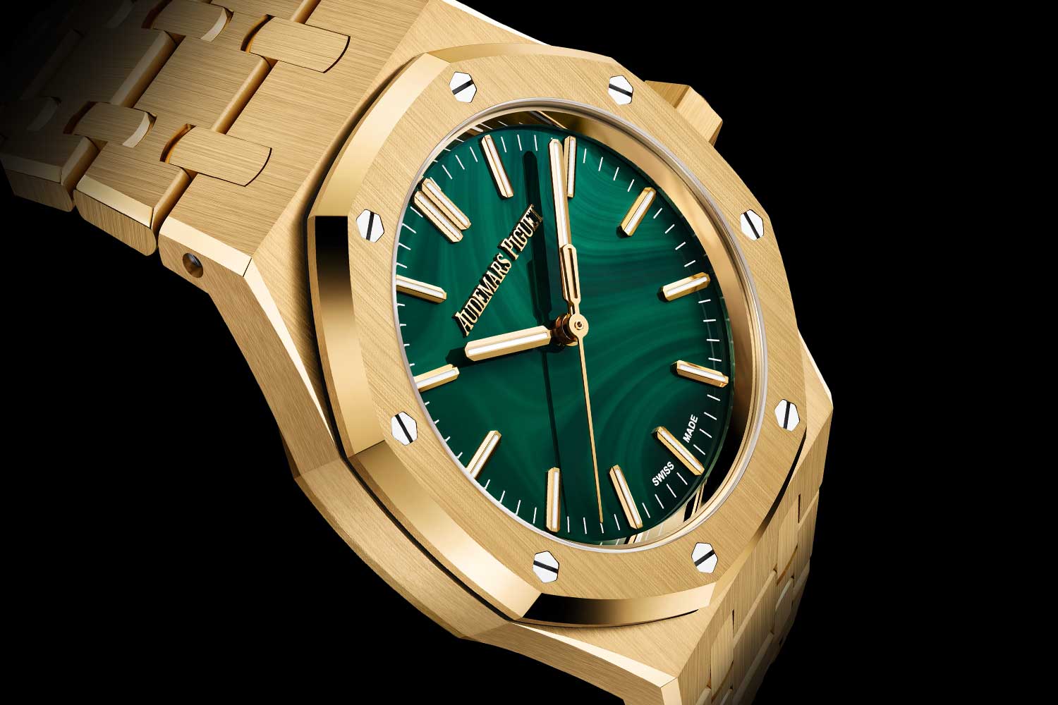 Dial Polished malachite dial, 18-carat yellow gold hour-markers and Royal Oak hands with luminescent material, yellow gold-toned inner bezel