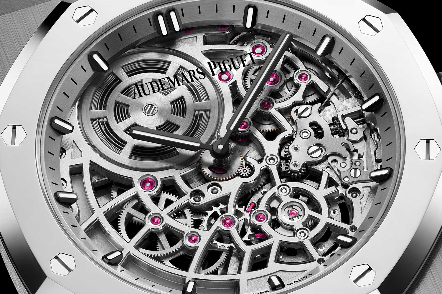Dial Rhodium-toned openworked dial, blackened 18-carat white gold rectangle hour-markers and Royal Oak hands with luminescent material, silver-grey toned inner bezel