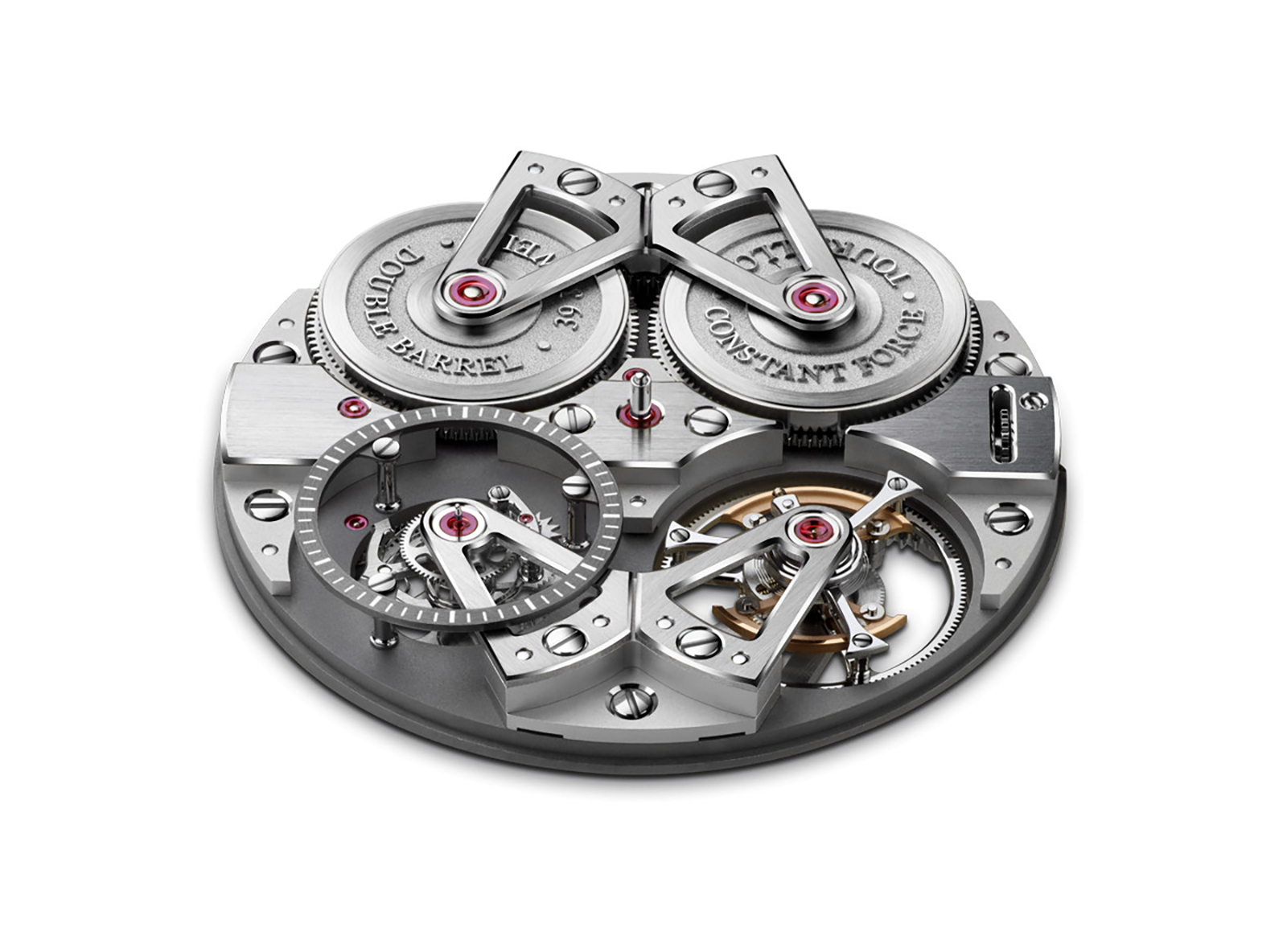 Meanwhile, the inner tourbillon cage drives the escape wheel around the fixed fourth wheel. So, it would not be correct to say that the one‑second remontoir here directly drives the escape wheel, as in the Pratt/Gafner model (which will be detailed later), but that it drives the cage, which in turn drives the escapement, which impulses the balance wheel. Clearly, every effort was made to keep every component in this assembly as light as possible, hence the ultra skeletonized escapement wheel created with MEMS (Micro‑Electro‑Mechanical Systems) technology. The end result is a watch that is not only a work of technical brilliance, but also extraordinarily beautiful to watch.