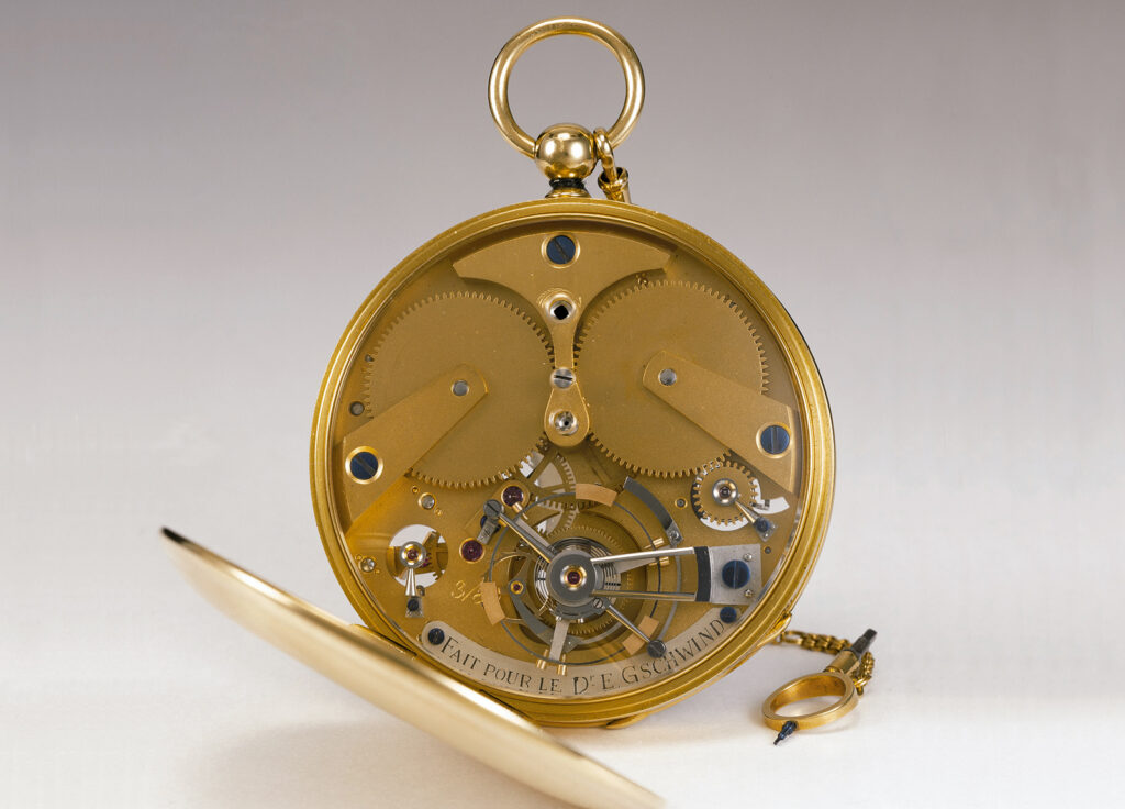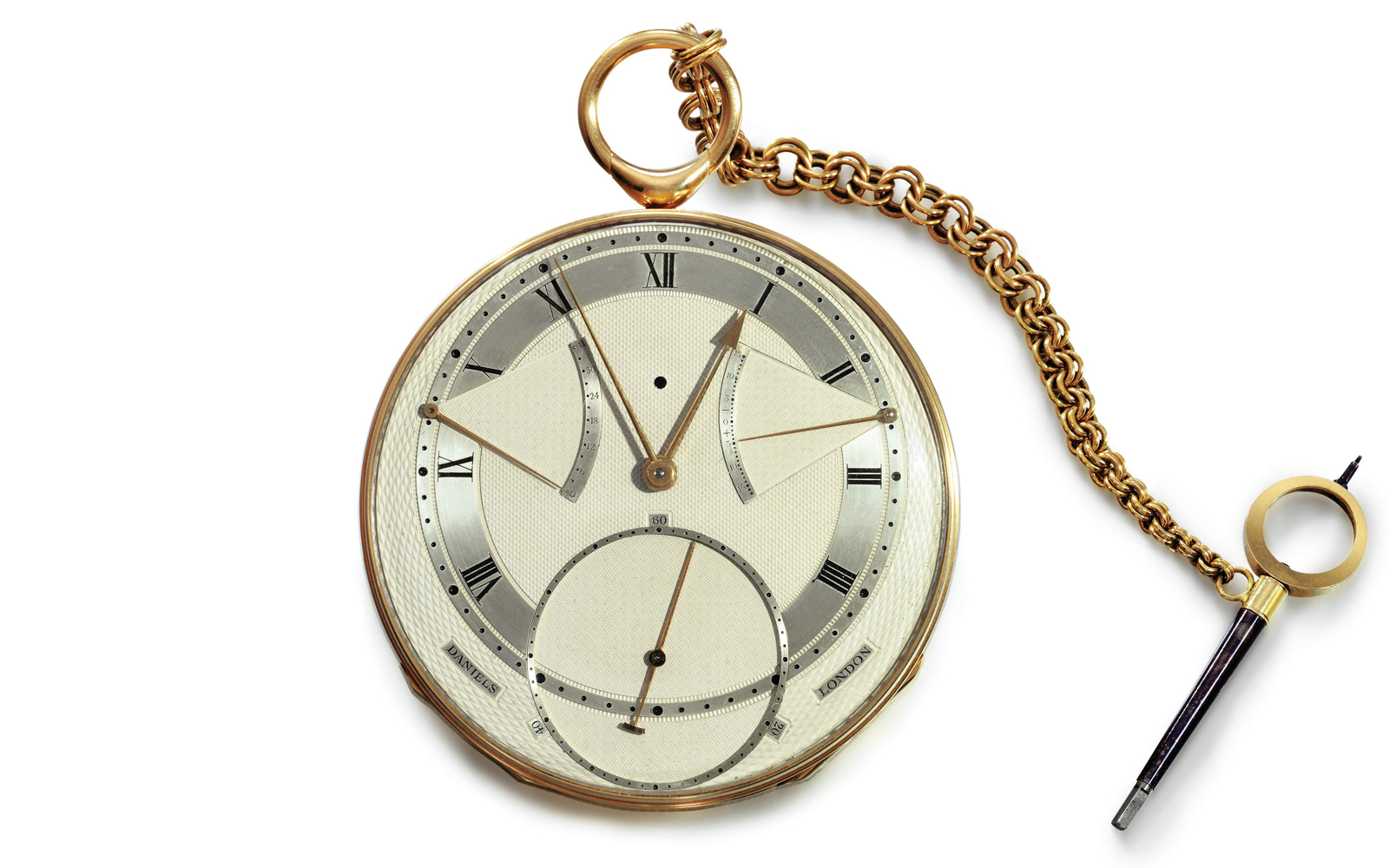 George Daniels’ tourbillon remontoir pocket watch created in 1975. It features a silver engine-turned dial with sectors for the Equation of Time and the state of winding