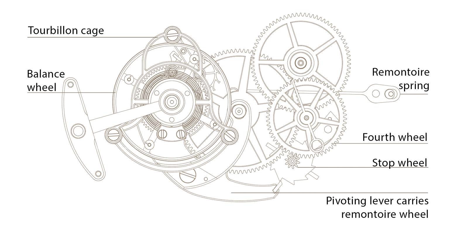 The remontoir spring is mounted on the fixed fourth wheel, physically positioned beneath the tourbillon cage. The third wheel in the going train powers both the cage pinion and a remontoir train that is unlocked by the tourbillon cage itself. The lower cage of the tourbillon is designed with four evenly spaced protrusions, one every 90 degrees. Each protrusion carries a small pin. As the tourbillon cage rotates, completing one revolution every 60 seconds, each pin trips a pallet jewel on the tip of a lever once every 15 seconds.