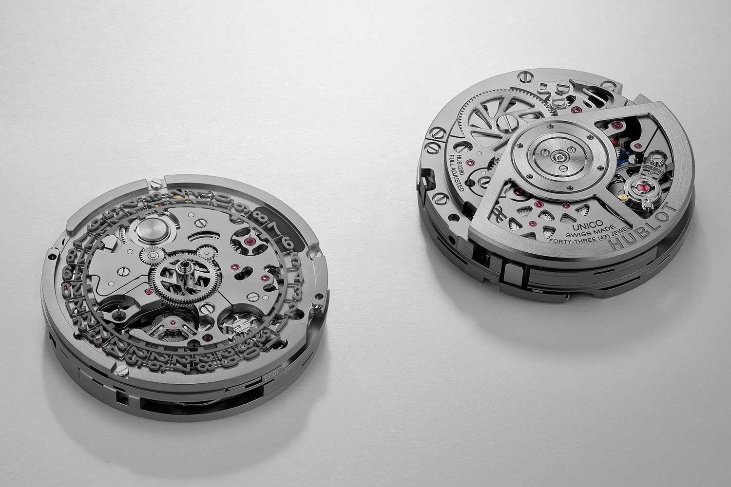 In 2018, the movement underwent a significant revamp and became the HUB1280. Its fundamental construction changed. Despite being on the dial side, the chronograph mechanism was no longer modular but fully integrated into the mainplate. This led to a significant reduction in thickness from 8.05mm to 6.75mm. Most notably, the new caliber adopted the principle of an oscillating pinion but the pinions were replaced with LIGA-fabricated nickel-phosphorous wheels with reactive, spring-loaded tooth profiles to address the issue of backlash and imperfect mating during coupling.