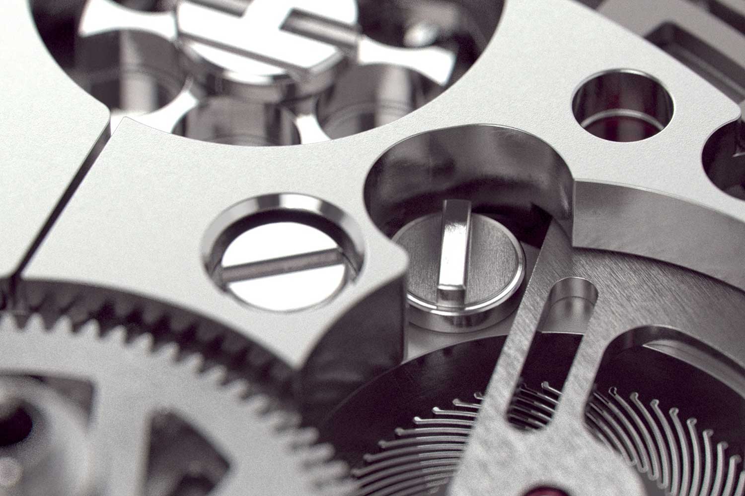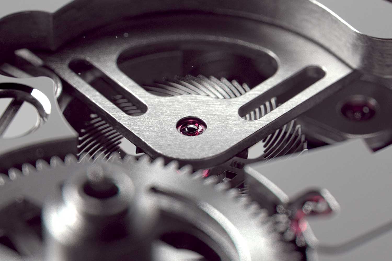Finally, the regulator was also redesigned with a toothed circular sector integrated directly into the arm. Fine adjustment is made by turning a screw that drives a pinion engaging this toothed arc. At the root of the teeth lies a flexible structure that maintains constant contact between the meshing flanks, eliminating play. This ensures smooth and precise regulation in either direction, while also making the mechanism easier for watchmakers to access and adjust.