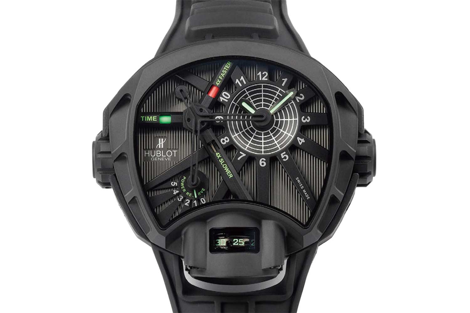 This decision naturally led to a modular construction, which is practical from a servicing standpoint and consistent with Hublot’s philosophy of industrial clarity by enabling components and complications to be interchanged or expanded in future evolutions. The most significant aspect of the movement is that it employed a double horizontal clutch system — one for the minutes recorder wheel, which was directly driven off the barrel, and one for the chronograph seconds driven off the fourth wheel.