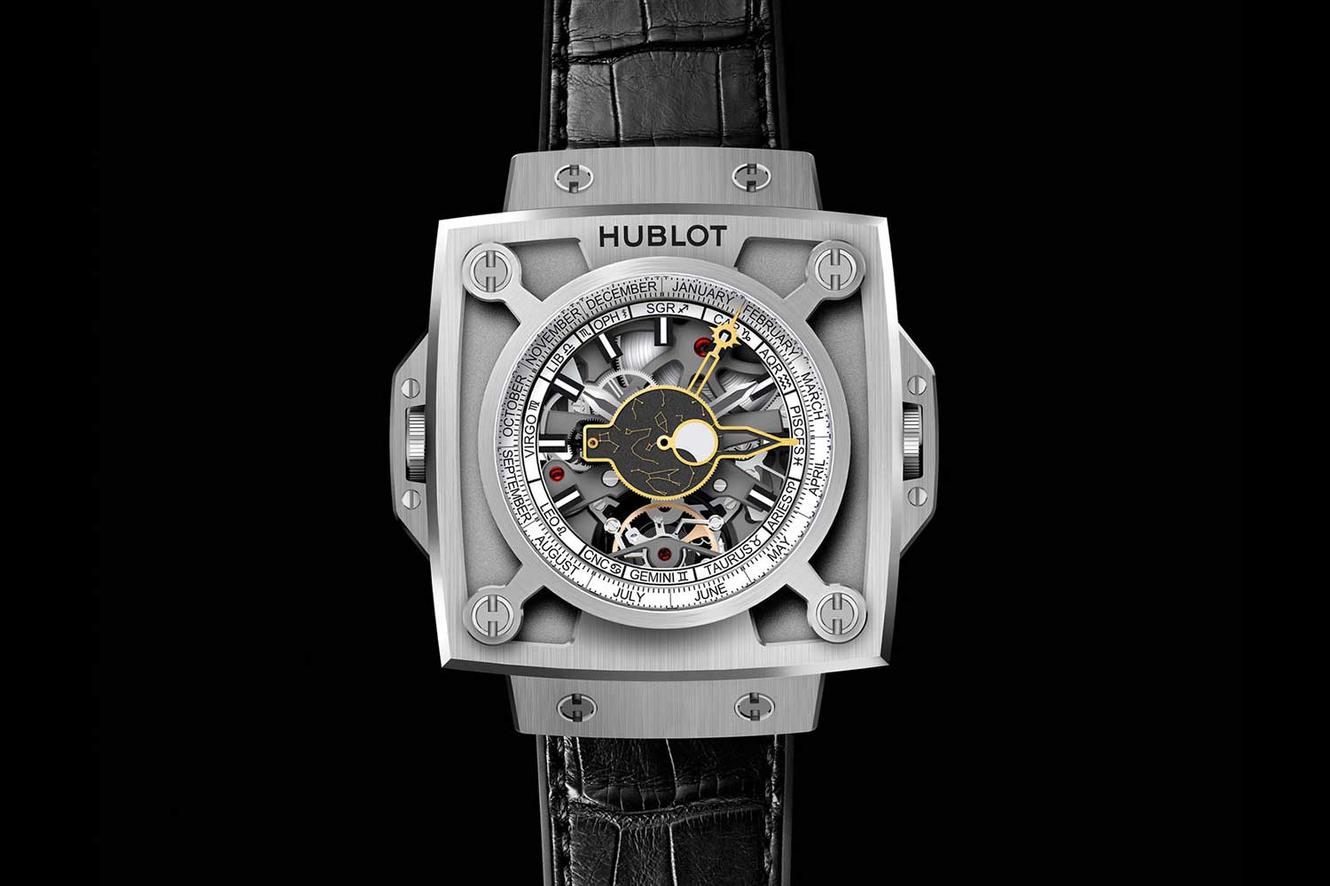 The original Big Bang MECA-10 arrived in 2016, initially in black ceramic and titanium cases. Though it’s a time-only movement with a power reserve display, its construction is visually complex. It was inspired by Meccano, the early 20th-century construction system invented in England by Frank Hornby. It consists of metal strips, plates, gears, pulleys, nuts and bolts, which can be assembled to build mechanical models like cranes, bridges and vehicles.