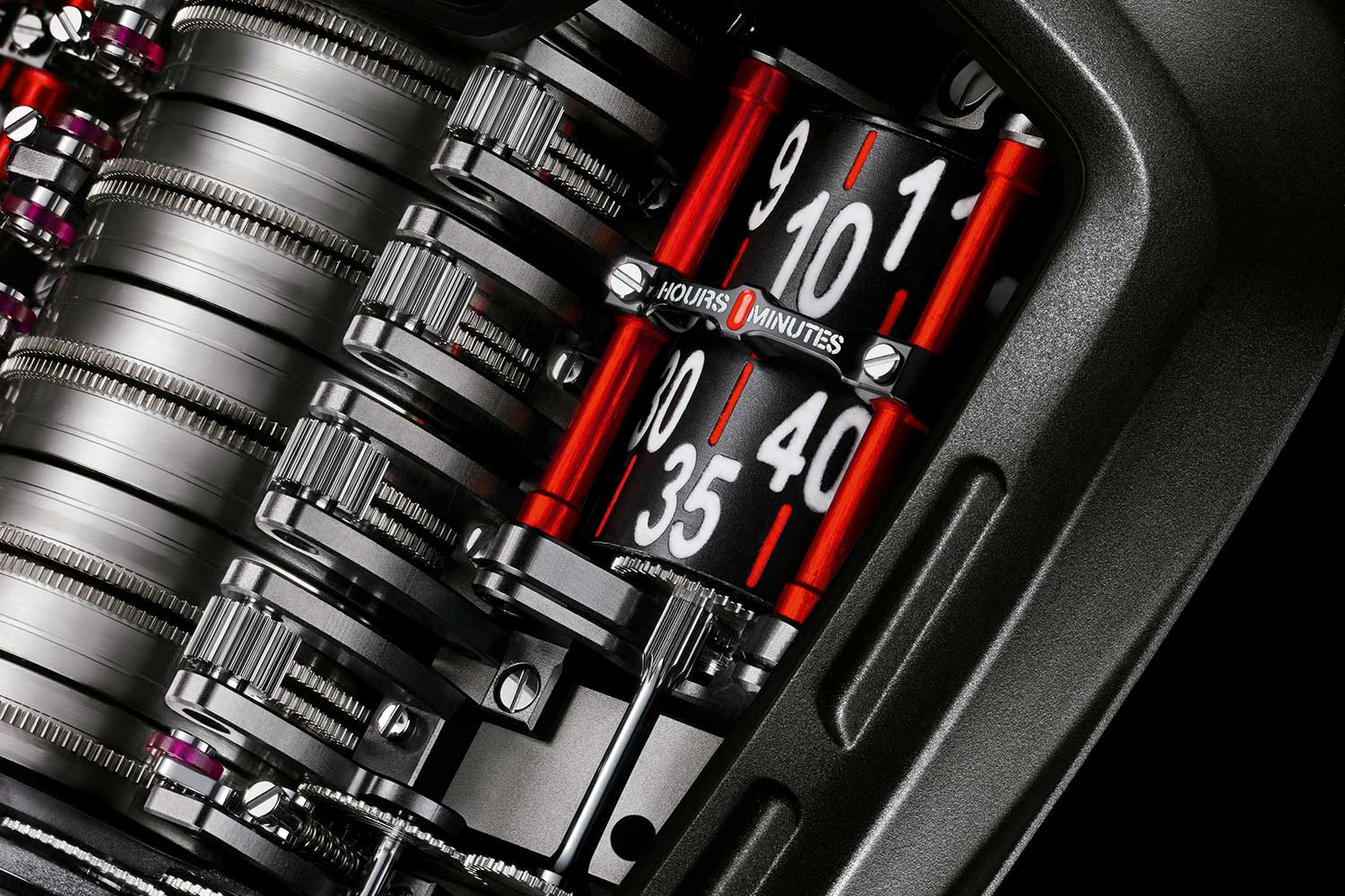 Where the MP-05 broke the case to accommodate its mechanics, the MP-11 folds the mechanics back into the case. The seven barrels form a straight horizon at the bottom of the dial, ending with a roller-based power reserve indicator while the gear train, balance wheel and time display occupy the upper half of the dial. The transition from the vertical to the horizontal plane is made possible by the helical toothing on the final barrel drum, which mesh with an intermediate wheel in the gear train cut with complementary slanted teeth.