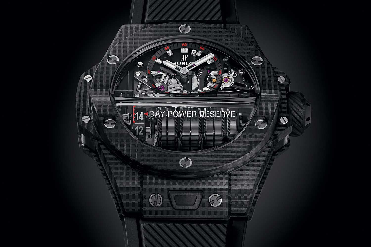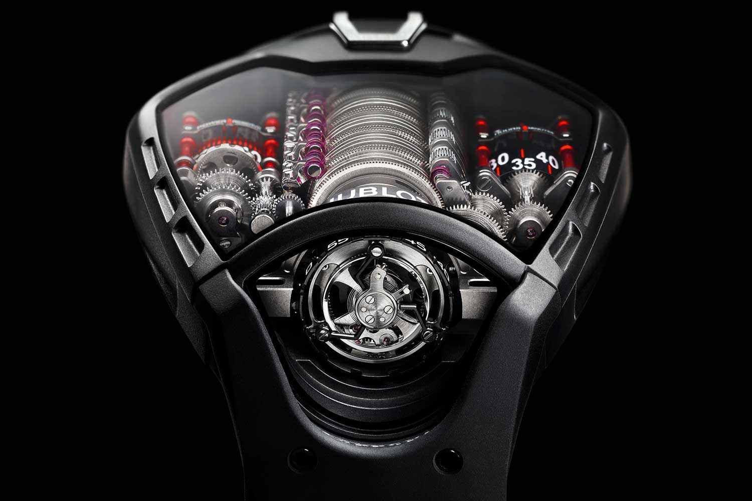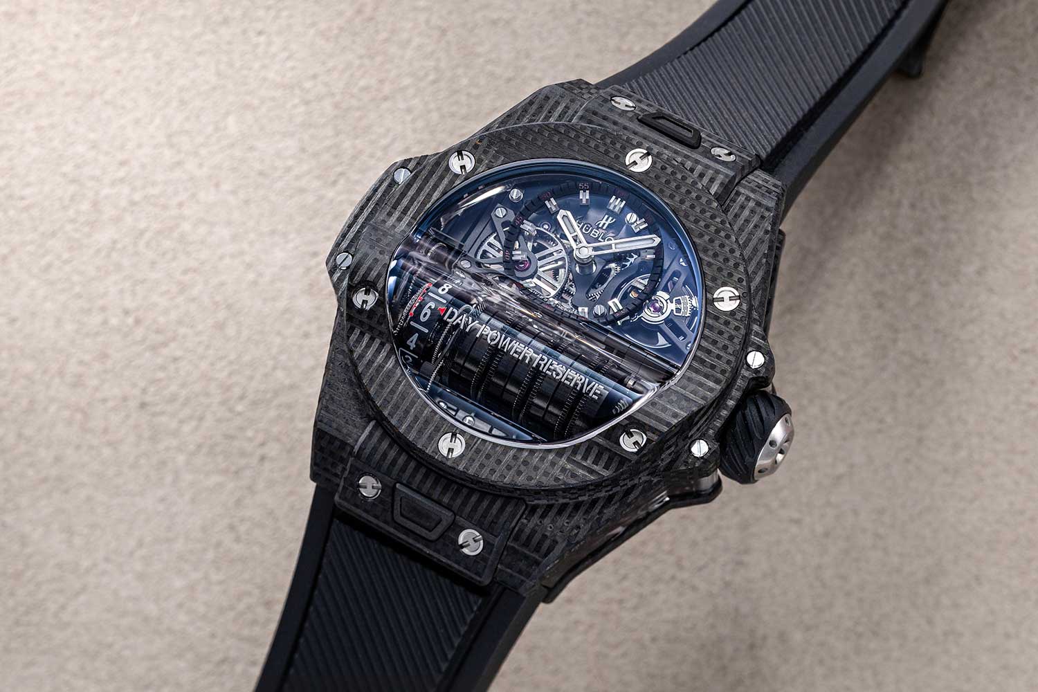The MP-05 LaFerrari with stack of mainspring barrels aligned vertically along the central axis of the watch (©Revolution)