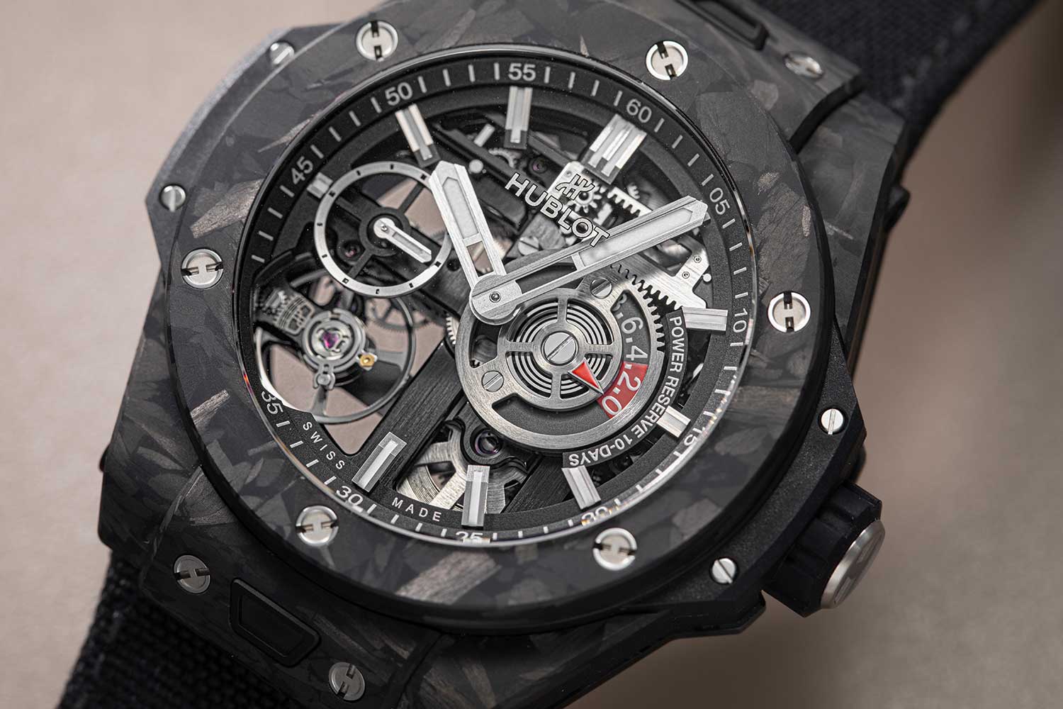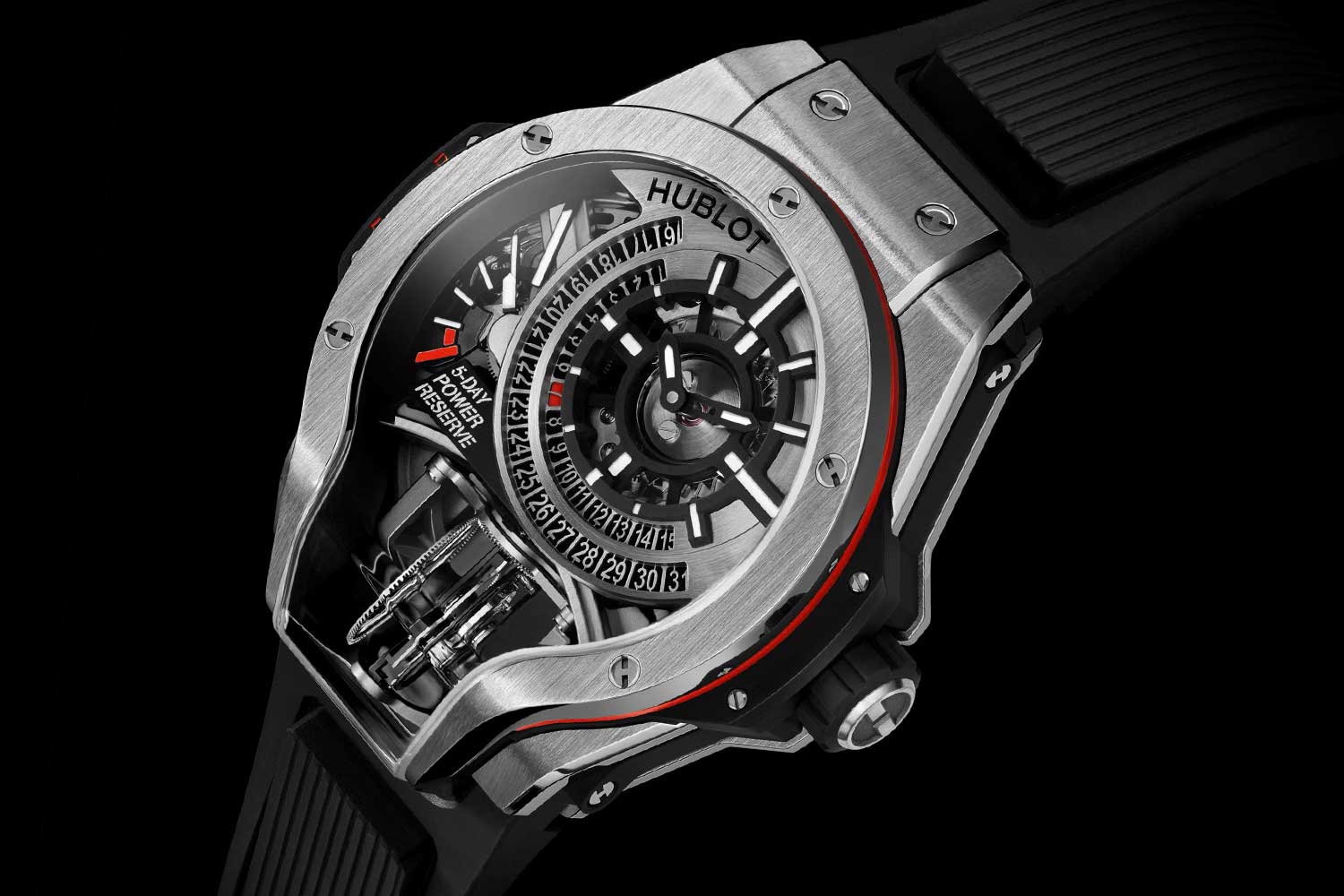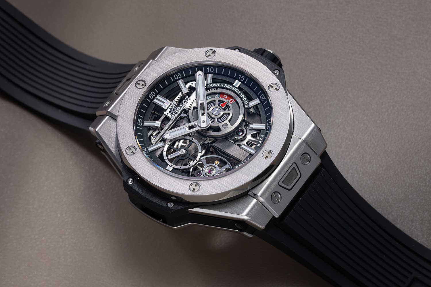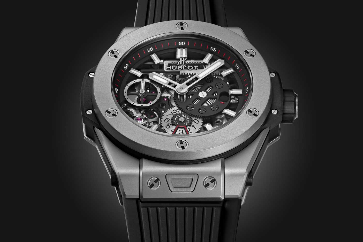 The original MECA-10 debuted in a 45mm case, but this year Hublot has introduced a more compact 42mm version. To fit the smaller case, the new Caliber HUB1205 had to be reduced in size as well from 35.2mm to 33.4mm. This downsizing required several modifications. Most notably, the secondary power reserve display at 6 o’clock has been omitted due to space limitations. As a result, the display at 3 o’clock now combines a red warning indicator that appears when only two days of power remain, with a co-axial hand that indicates the exact number of days left in the power reserve. Another update is the addition of a hacking seconds function. Pulling the crown now stops the balance wheel, allowing the time to be set precisely to the second.
