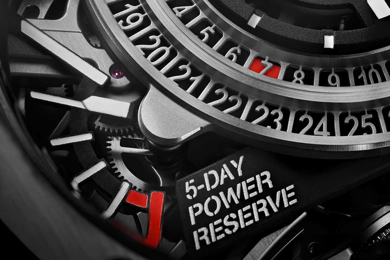At the heart of the MP-05 is a stack of mainspring barrels aligned vertically along the central axis of the watch. These barrels are mounted in series and the result is a staggering 50-day power reserve. Till today, it holds the record for the longest power reserve of any wristwatch.
