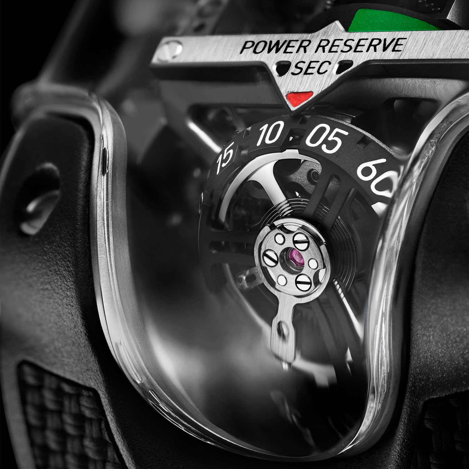 Beyond its mechanical ingenuity, the linear winding system offers an architectural advantage. It can be integrated into non-orthogonal movement layouts where a traditional rotor would be obstructive. In the MP-10, this freedom is used to full effect. The twin linear weights flank the hours and minutes displayed on aluminum rollers, alongside a circular power reserve indicator, while the tourbillon and seconds display are set on an incline.