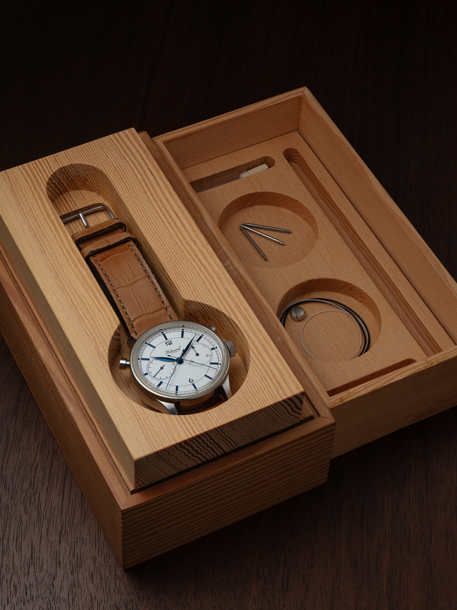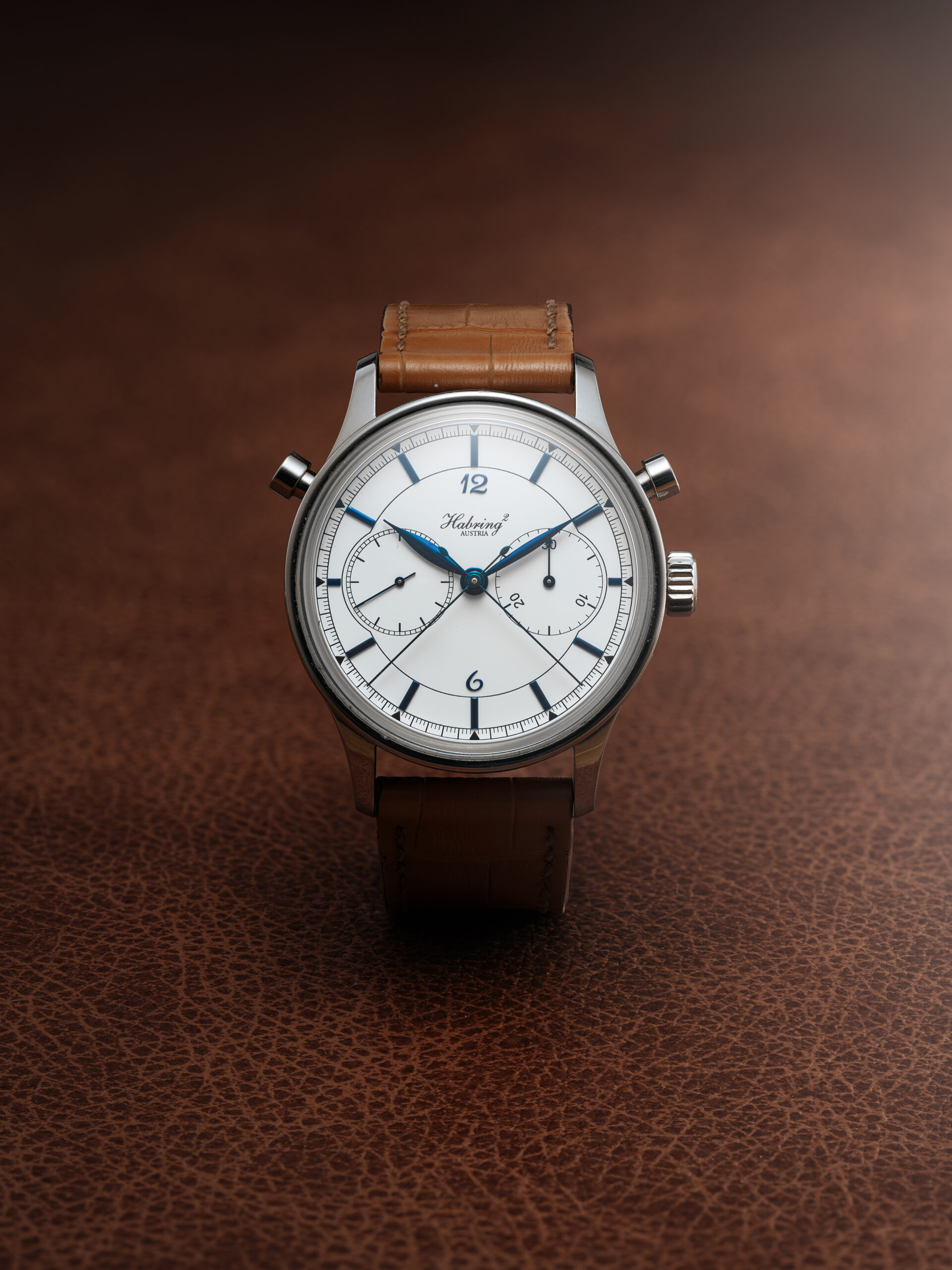 Traditionally, Habring’s split-seconds chronographs use two pushers for the start, stop and reset functions of the chronograph and another for the split-seconds function. For this special edition, however, all chronograph operations are compressed into a single pusher, creating both mechanical elegance and visual symmetry reminiscent of timing instruments from the 1960s. The watch is powered by Habring’s A08MR MONO calibre, a refined, manually wound movement that showcases the brand’s mechanical ingenuity.