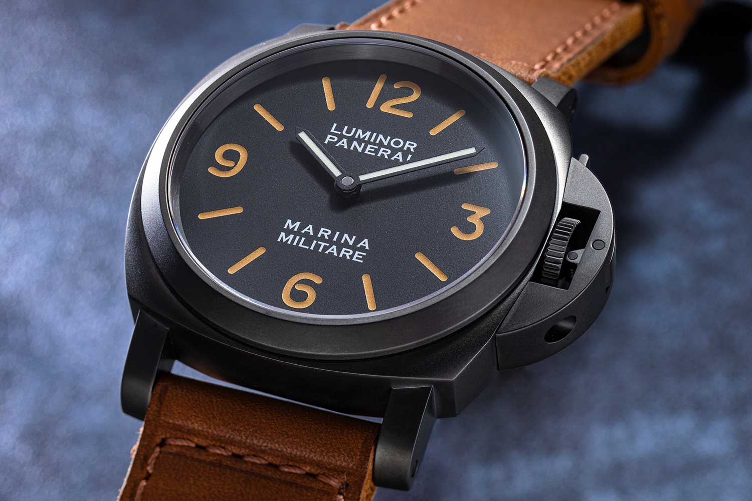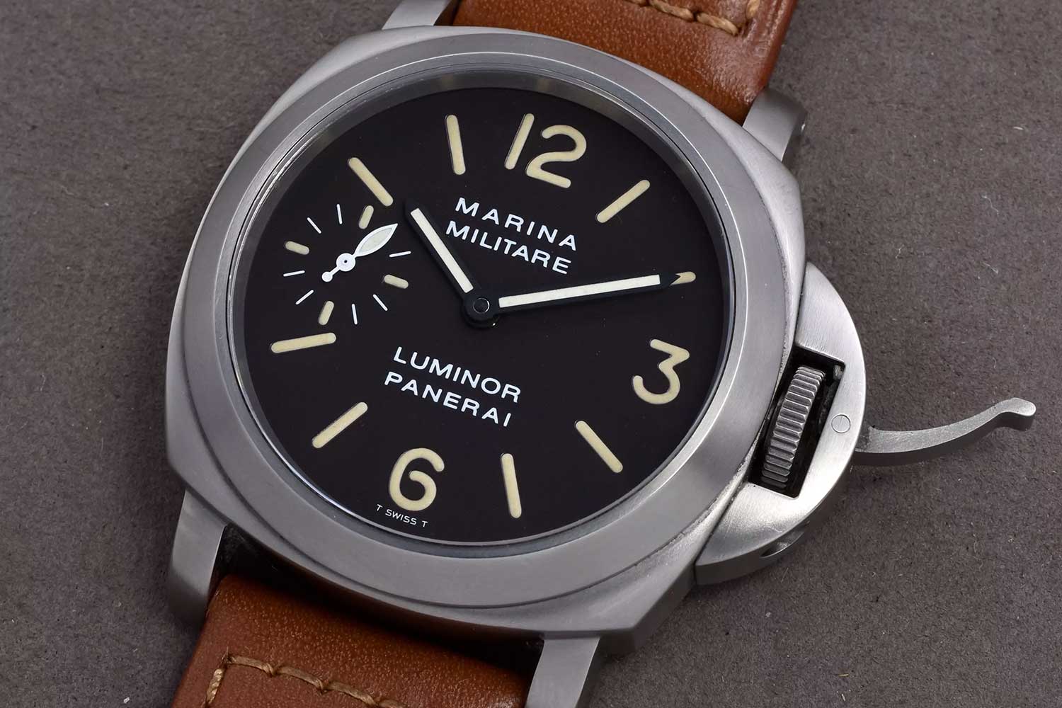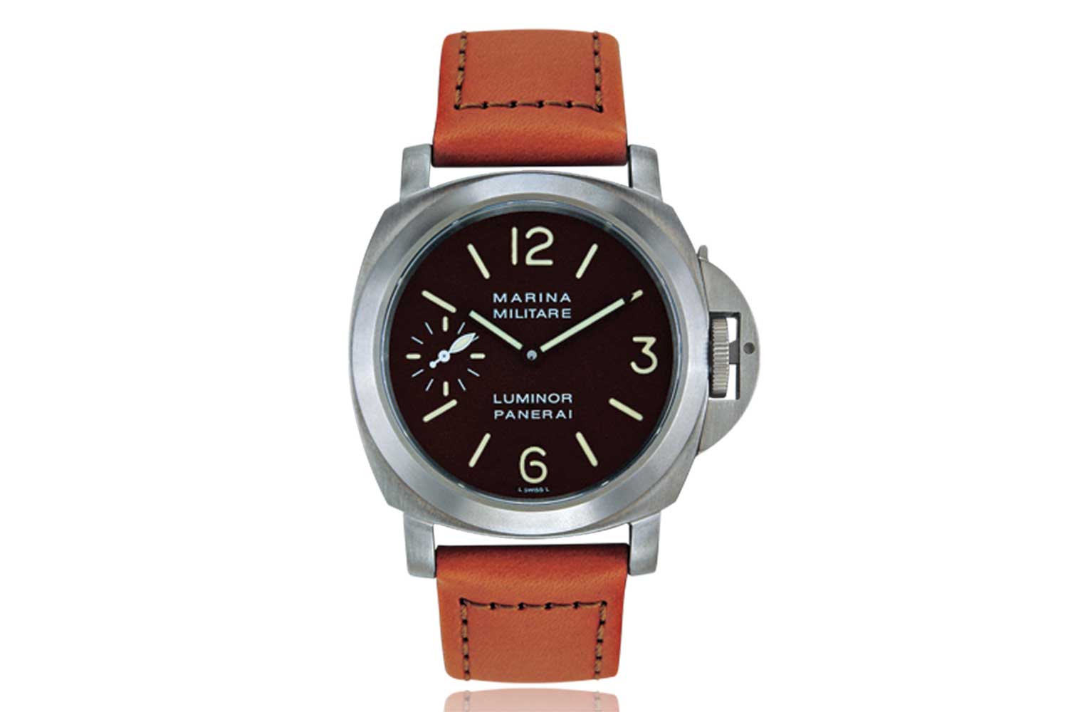 The distinct PAM00036 watch with titanium case and tobacco-brown dial appeared in the 1998 catalog in all its transcendent glory. Yet somehow, the watches weren’t released until 1999, which explains why they were engraved with a “B” serial number, corresponding with that year. A popular theory is that Bonati intended the PAM00036 as part of the first salvo of watches. Giving credence to this is the fact that the luminous indexes of the PAM00036 are tritium. Tritium was used for all “A” series dials; however, because of changes in Swiss law, by the “B” series the following year, all Panerai dials (with the exception of its professional certified diving watches and special edition PAM00040) would feature Luminova indexes. This would lead us to believe that the dial of the PAM00036 could have been manufactured in 1998, along with all other A-series tritium dials.