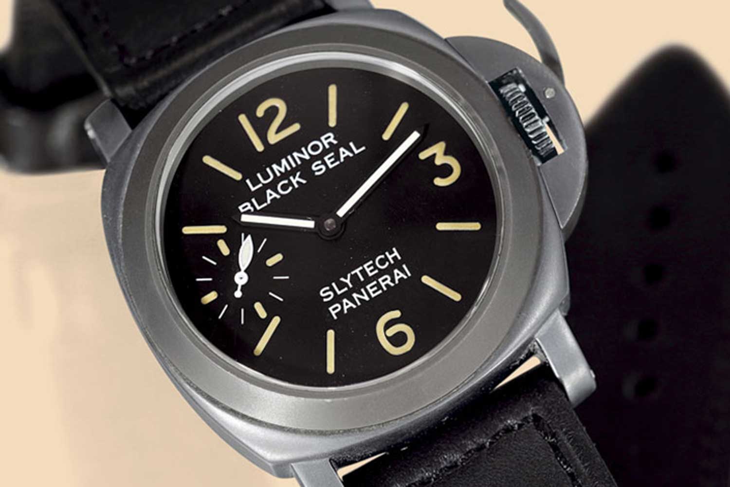 The original “Logo” also makes the list of the greatest Luminors of all time. Why? Because it basically created the blueprint for modern Panerai watches. Bear in mind that until 1993, when this timepiece was launched, there was no 44mm model. This took the design cues of the military watches and compressed them into a civilian watch that still resonated with all the charm, allure and heroic narrative of the watches used by the Italian Navy. It also embodied the Zen reductionist pure essence of modern Panerai with its polished steel case and lever lock mechanism. As there is no small seconds, it is only the full 12, 3, 6 and 9 Arabic indexes that are on display, and the dial is emblazoned with “Luminor Panerai” and the famous Panerai stylized logo. The initial plan was to manufacture 899 units, but in the end, just 687 units were produced, with the remaining 212 watches used for the three different “Slytech” collaborative editions.