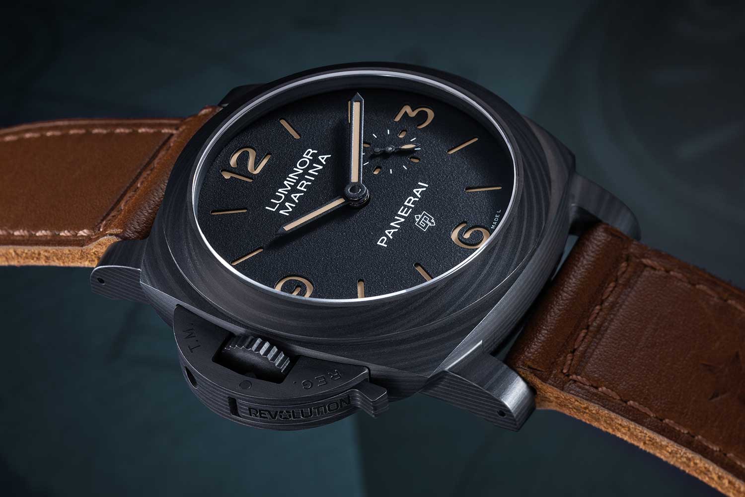 A distinguishing mark of this special Panerai x Revolution 20th Anniversary Luminor Marina Destro Carbotech PAM01708 (©Revolution)