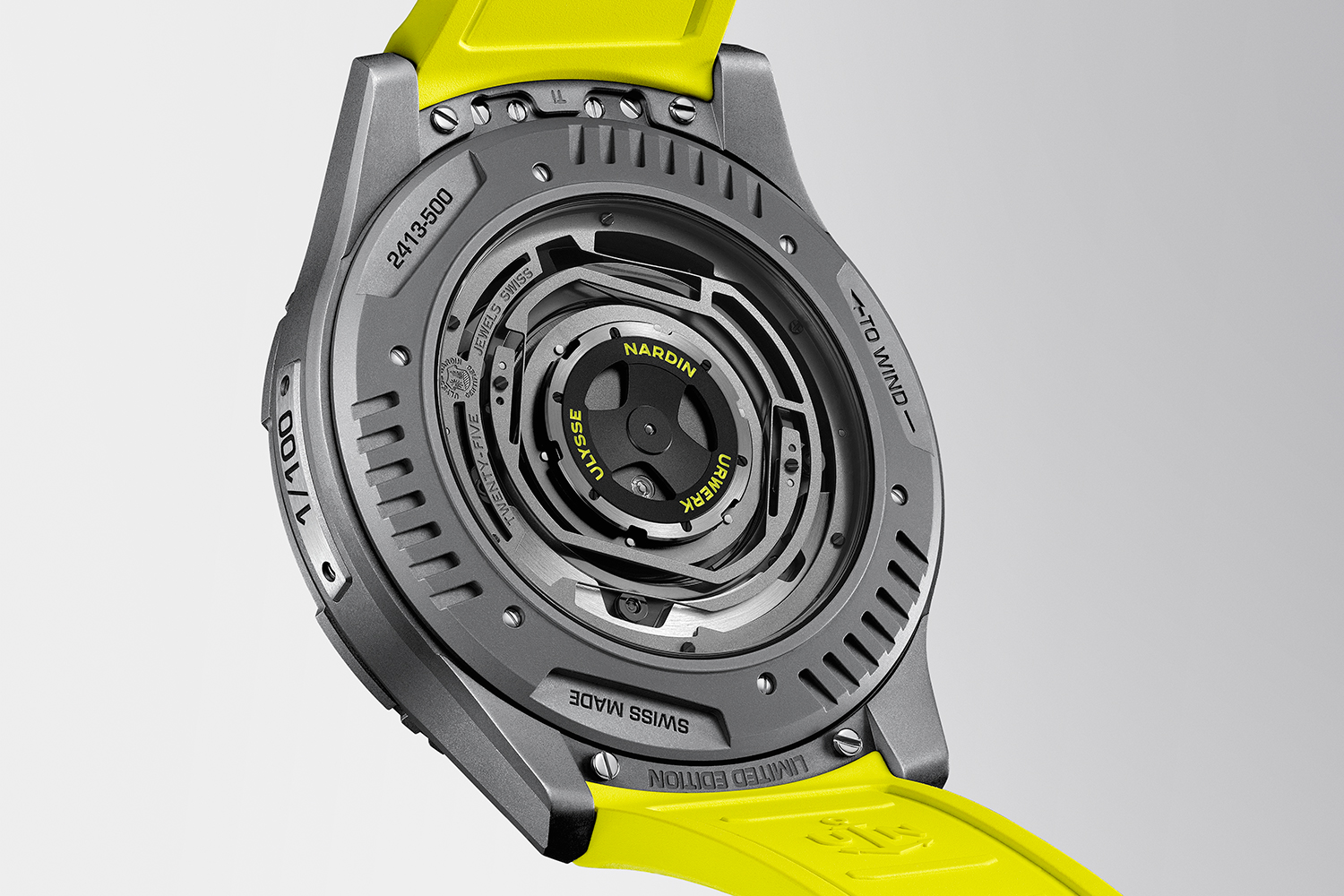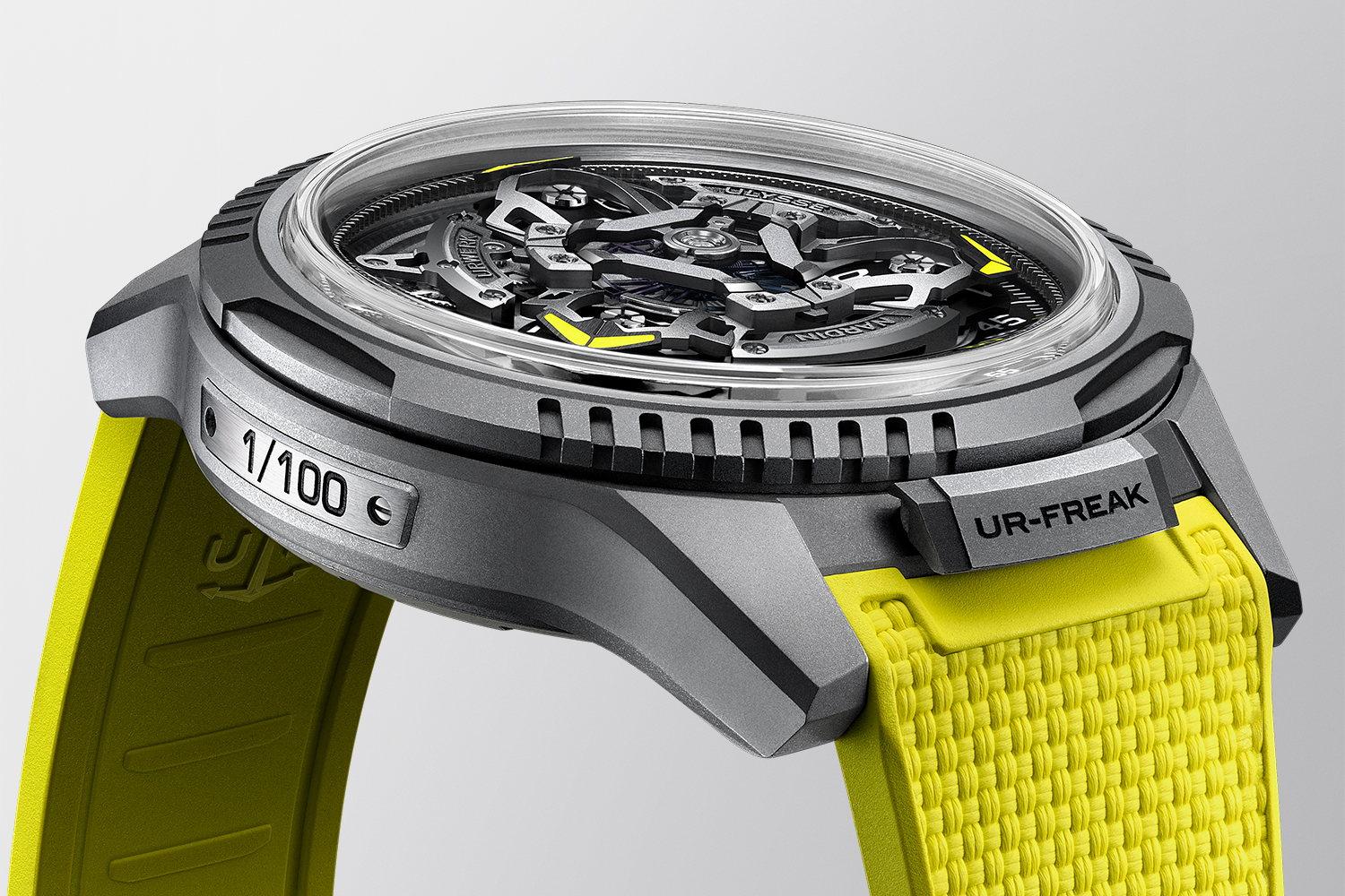 One area in particular where both brands allow their respective identities to fuse freely is the case. Based on the Ulysse Nardin Freak [ONE], the UR-FREAK comes in a rugged anthracite grey sandblasted titanium case. Three fluted sections on both the bezel and caseback are immediately recognisable as URWERK characteristics, as is the electric yellow colour that adorns the satellite pointers, minute markers and rubber strap.