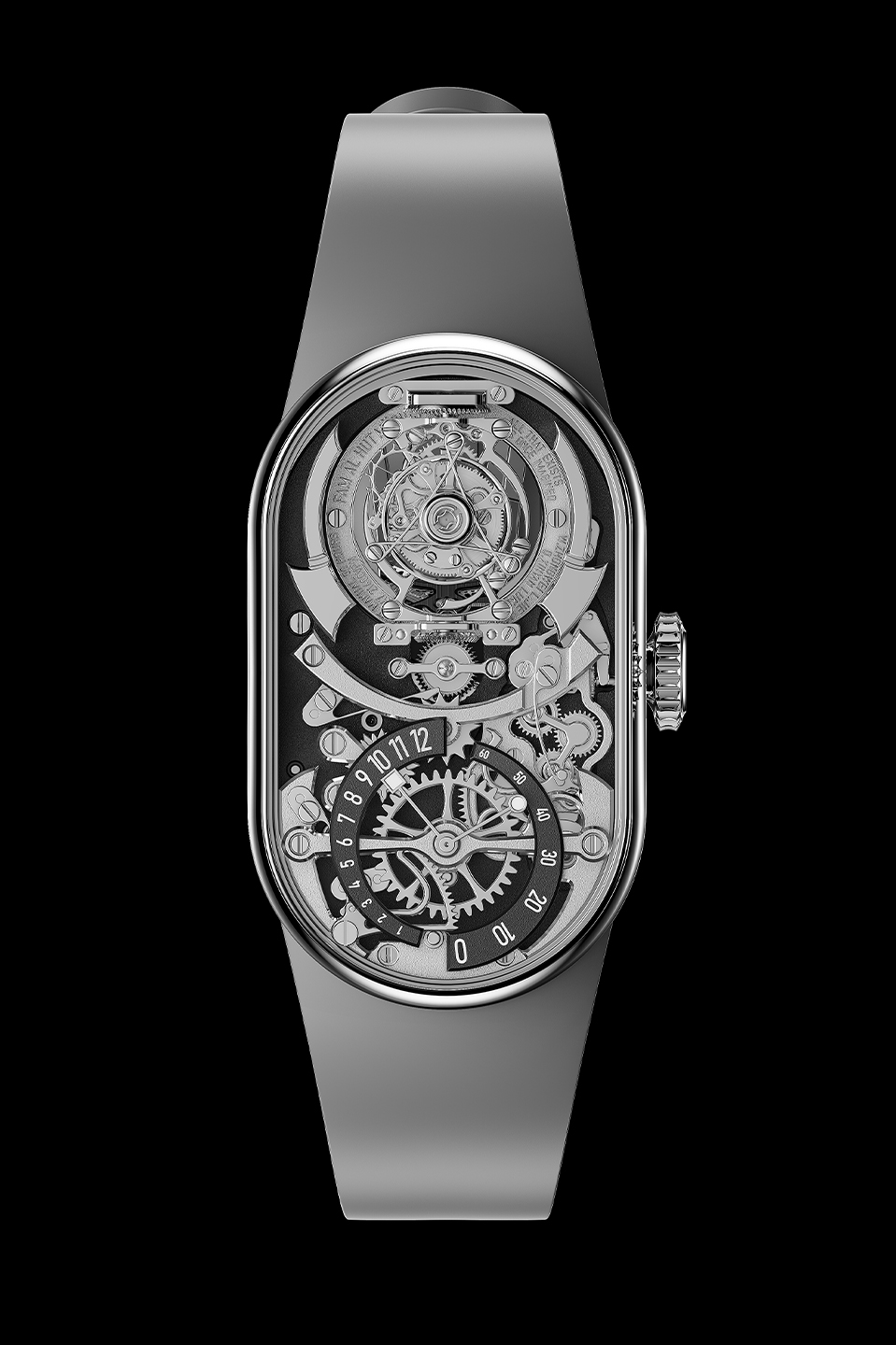 There are hardly any losers in this category, but the winner is the winner because it is extremely challenging to make the tourbillon, the most three-dimensional of mechanisms, operate in a space so thin it barely exists. Compressing a rotating cage, its bearings, its fixed wheel and its regulator into a 1.85mm watch is not a matter of incremental thinning but of reconceiving every structural assumption the mechanism normally relies on. The lower cage bridge doubles as the driving wheel to allow the cage to be driven on its periphery, an internal-toothed fixed ring encircling it rather than sitting beneath it, and compliant, openworked arms that suspend the pivot bearings while absorbing shocks in lieu of a traditional shock absorber.