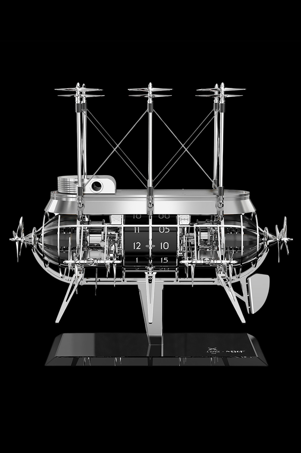 The Albatross combines an hour and half-hour strike with a full automaton composed of 16 pairs of propellers that animate on the hour. It allows the owner to choose full operation, complete silence, propellers without sound, or sound without propellers. A repeat-on-demand control repeats whichever program is selected or, if preferred, sets the propellers into continuous motion. There are two separate movements and three barrels in total: one for timekeeping, one for the strike, and one to power the animation. Coordinating the various modes requires a level of complexity that is not far removed from a grande sonnerie and all in the form of Jules Verne’s fictional airship. It doesn’t get better. – Cheryl Chia