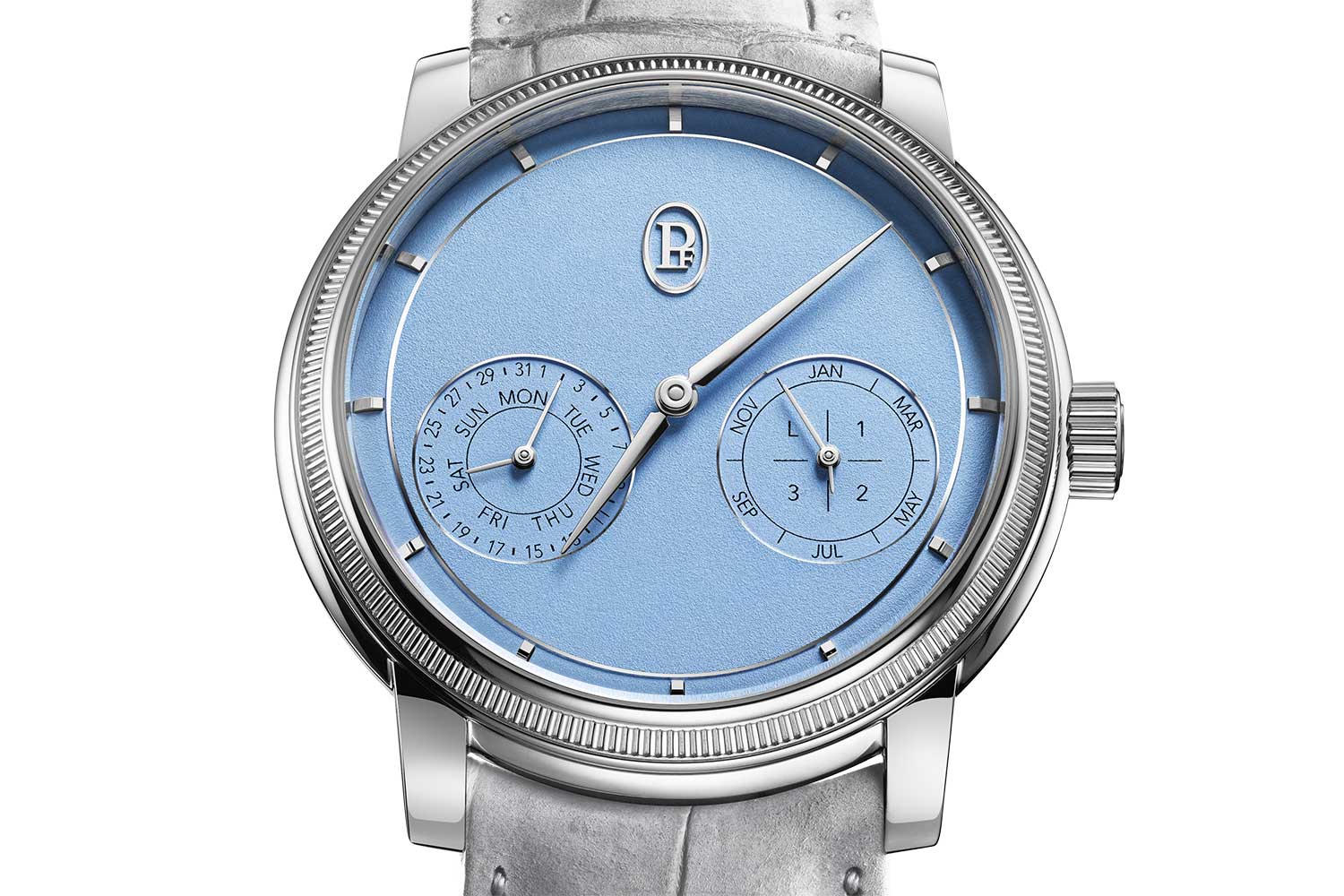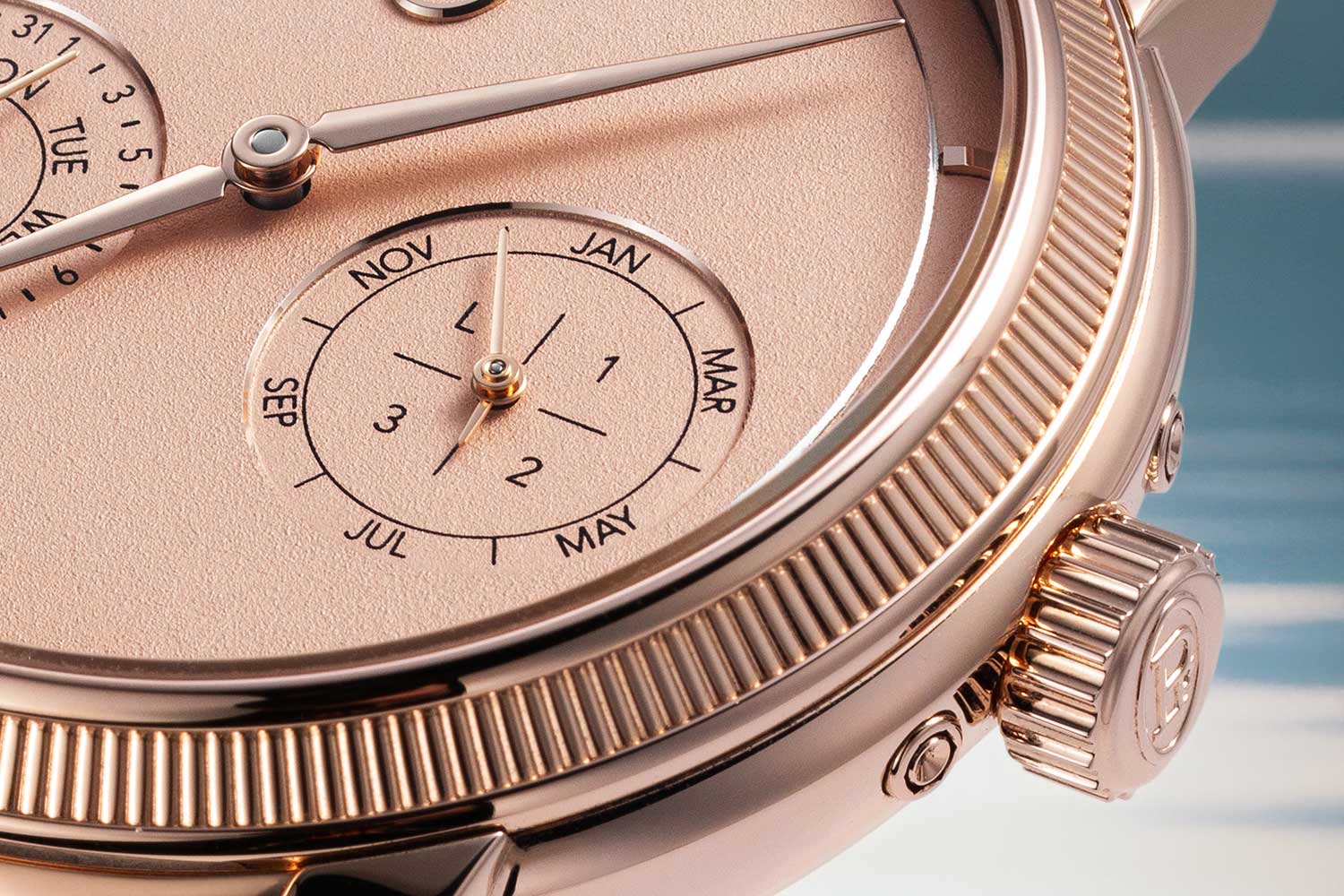 “We love purity,” Terreni says. “I’m not a fan of busy dials.” The design team split the calendar information into two co-axial counters positioned just under the 3 and 9 o’clock horizon. No disk overlaps, there are no lopsided masses of text. The day and the month are read effortlessly; the date, naturally; the leap-year indication is integrated without theatrics. The moonphase was eliminated altogether. “It’s an additional information,” Terreni shrugs. “It’s pleasant but tangential to the complication’s essence.”