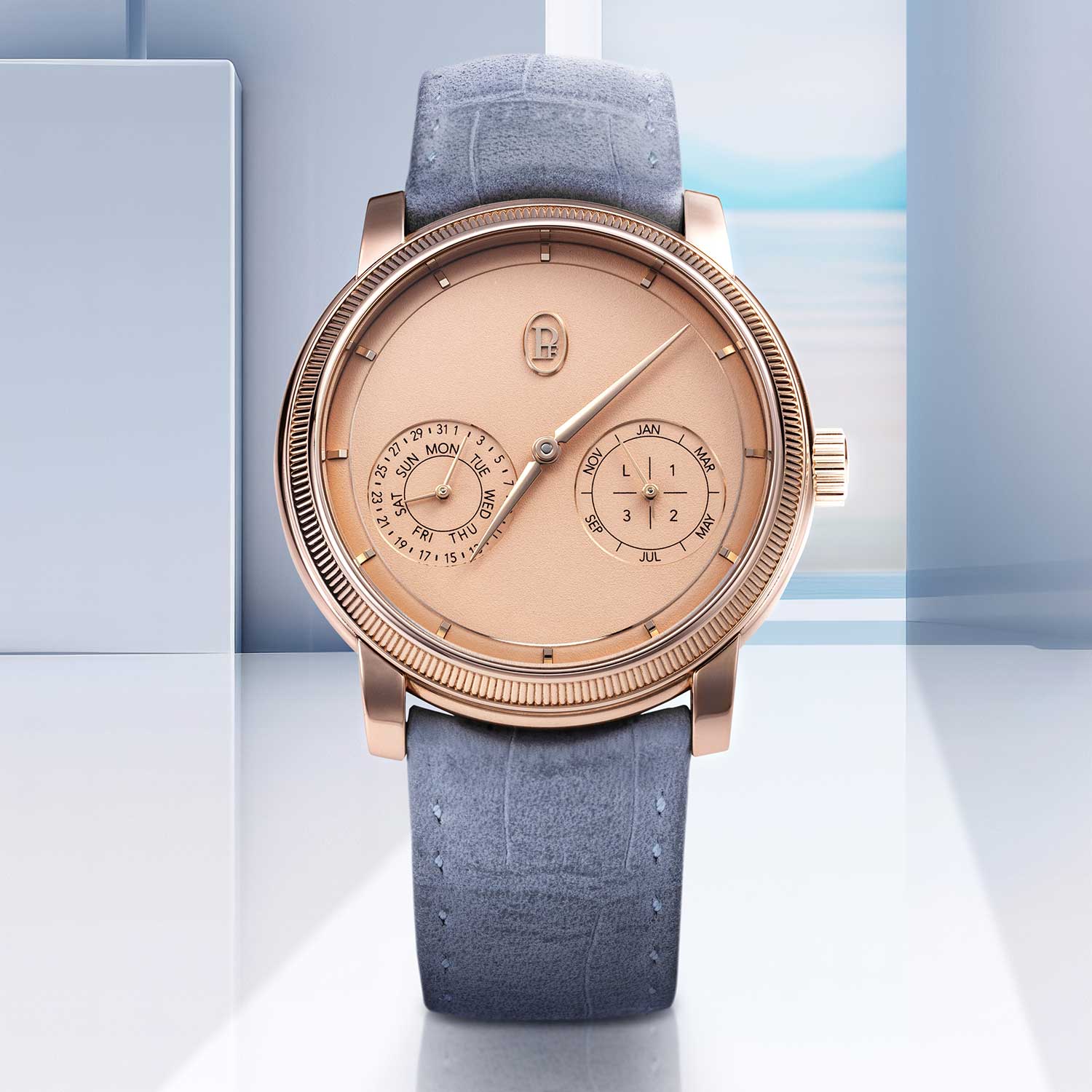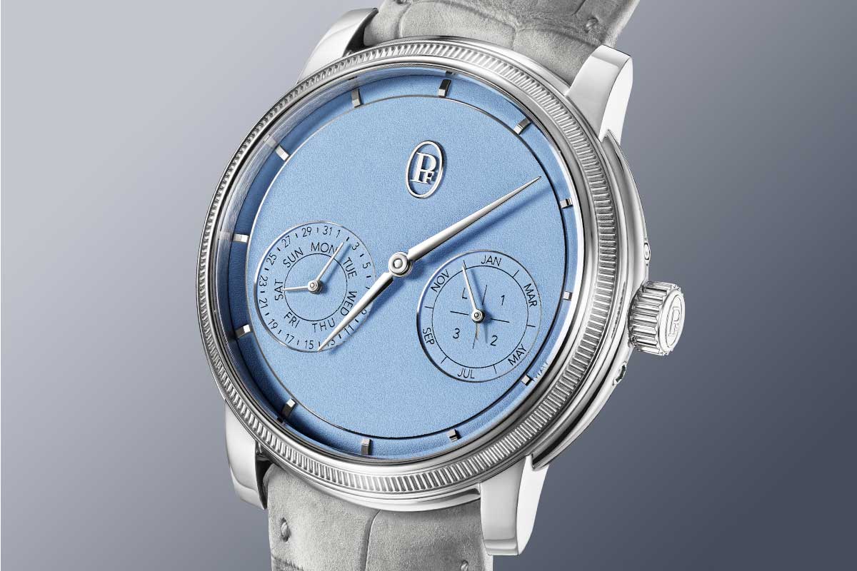 Offered in two limited editions of 50 pieces each, the Toric QP comes in the “Golden Hour” execution, pictured on our cover and cased in rose gold with a hand-grained golden dial, as well as in a platinum “Morning Blue” version. Both share the same quiet eloquence, the blue expressing calm, morning clarity while the gold glows with warmth and late-afternoon light.