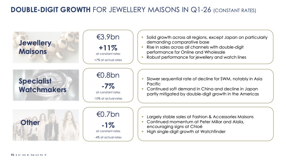 Group sales reached €5.412 billion for the quarter ending 30 June 2025, up +6% year-on-year at constant exchange rates (+3% at actual rates). Sales at the jewellery maisons (Cartier, Van Cleef & Arpels, Buccellati, and Vhernier) rose +11% at constant FX to €3.914 billion. This double-digit growth outpaced all other divisions and was supported by demand across all regions except Japan. It is the third straight quarter the jewellery houses have achieved double-digit increases.