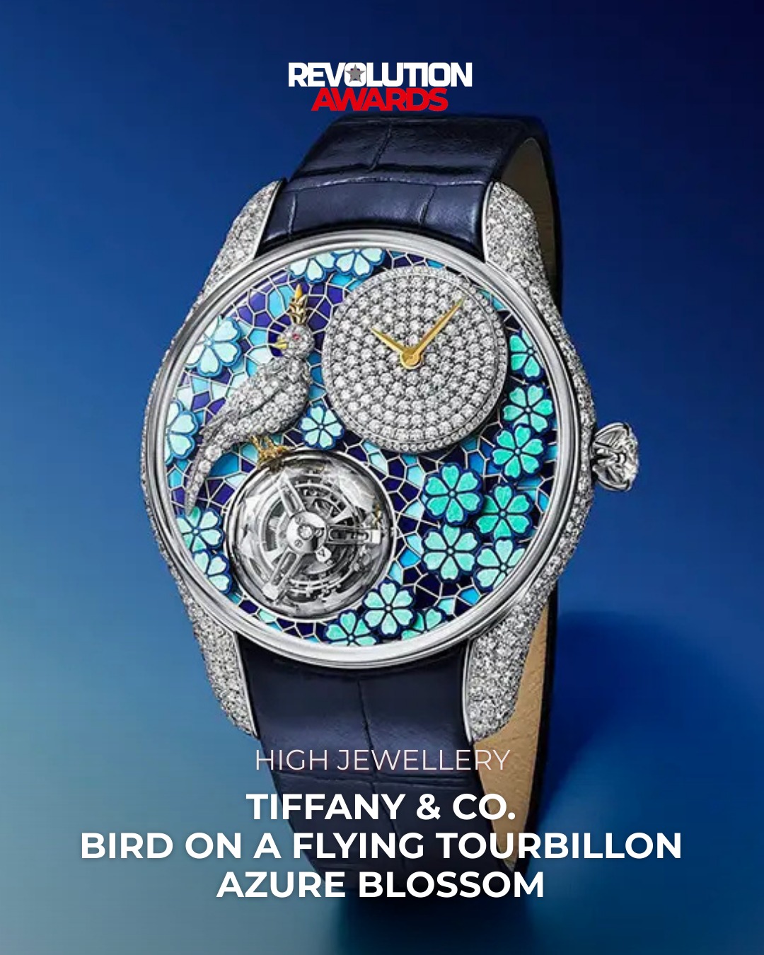 Given the strong contenders this year, the bar is high for the category of Best High Jewellery. @tiffanyandco Tiffany & Co.’s Bird on a Flying Tourbillon – Azure Blossom checks all the boxes, beginning with the glorious diamond bespeckled bird perched on the edge of a flying tourbillon and set amidst a sea of appliqué lacquered flowers.