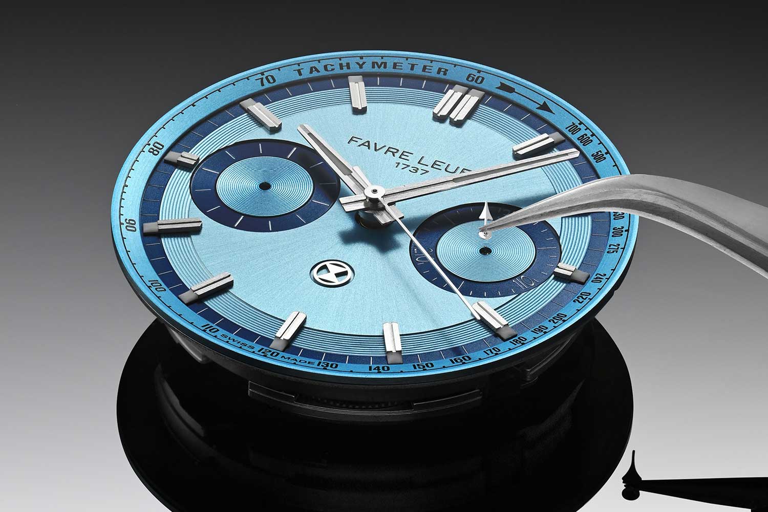 Impressive as the case profile is, it’s the dial the eye is immediately drawn to. The layout is modern, with hefty splashes of vintage inspiration evident in the baton numerals and minute track. Favre Leuba’s emblem — a stylised hourglass — sits above the six o’clock position. In terms of colour, there are three options at launch, all in a vibrant sunburst. Black and dark blue are popular choices and hard to fault, but it’s the ice blue version that is the clear standout — thanks to the high contrast dial elements. The dynamism of the dial is further enhanced by the raised subdials of the bi-compax chronograph registers, along with the applied, rhodium-plated hands and markers, all coated in Super-LumiNova.