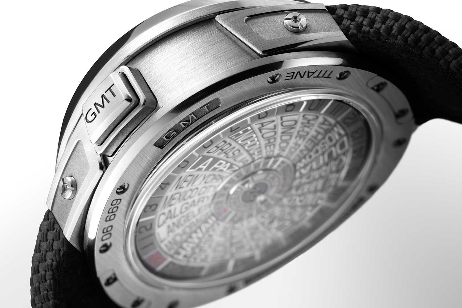 The caseback shows a lacquered and hand matt-lapped disc engraved with global cities, plus UTC and daylight saving references