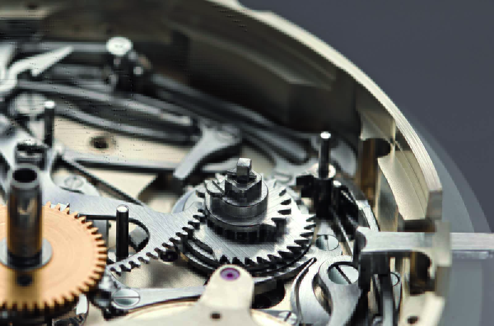The three racks – hours, quarters and minutes – are superposed on a separate pivot axis. Since the racks are not required to carry individual sets of ratchet teeth to engage separate striking pallets, nor to engage stacked pallets as in traditional repeaters, there is no need for vertical spacing or play between them. This compact layering is also made possible by the clever use of clicks that mechanically link the racks in sequence, allowing them to function as a single kinematic chain without interfering with one another.
