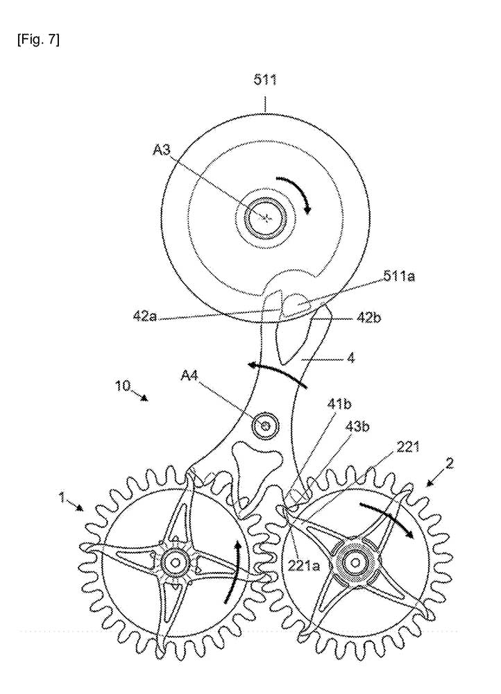 In the first configuration, the design mirrors Breguet’s original concept, in which the locking teeth and drive toothing are on separate planes. Attached to each escape wheel is a four-armed component (121, 221) with elongated, curved profiles terminating in rounded tips (121a, 221a) that engage with the locking surface (43a, 42b) of the lever. These serve as locking teeth, halting the escape wheel in turn.