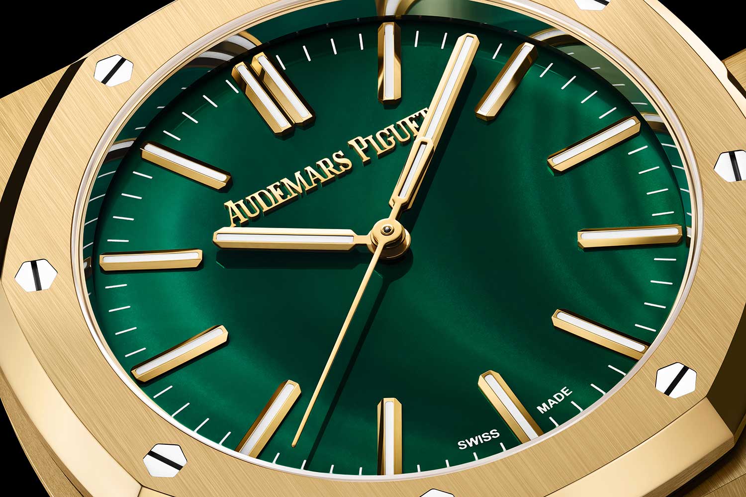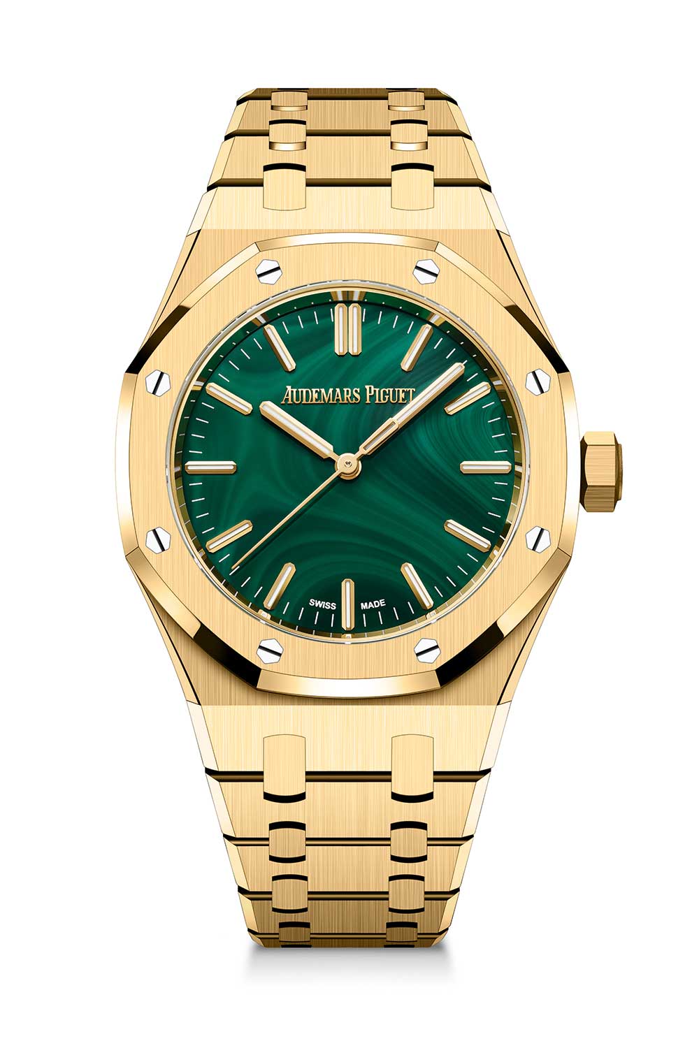 Dial Polished malachite dial, 18-carat yellow gold hour-markers and Royal Oak hands with luminescent material, yellow gold-toned inner bezel