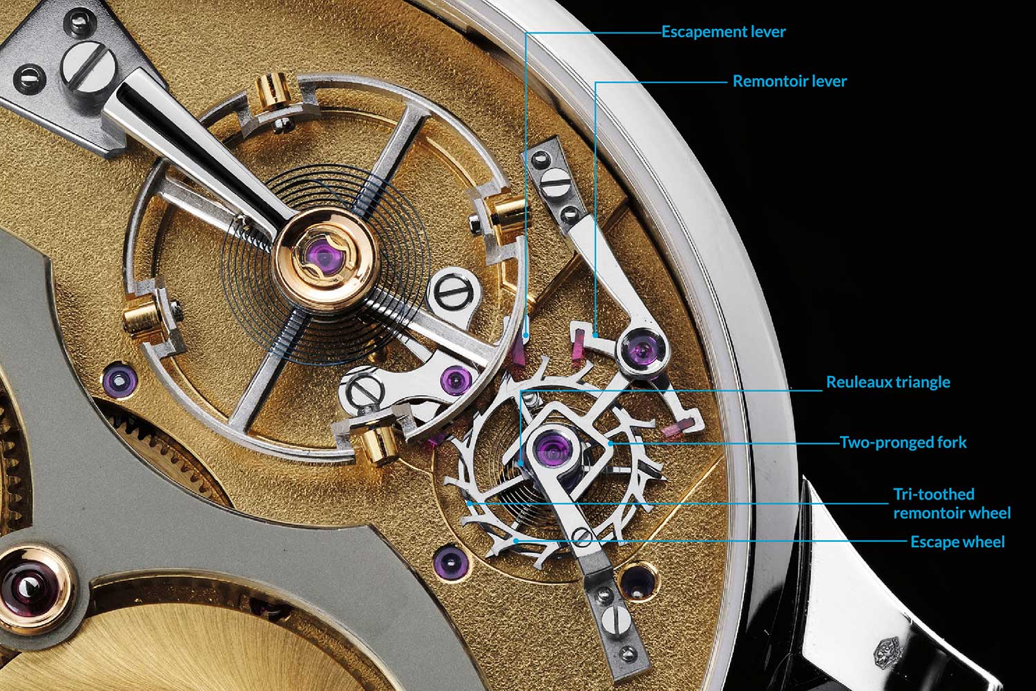 The tourbillon cage has four protrusions, each carrying a small pin that trips a pallet jewel on the tip of a lever. A secondary lever attached to it then releases the remontoir train to power the remontoir spring located beneath the tourbillon cage