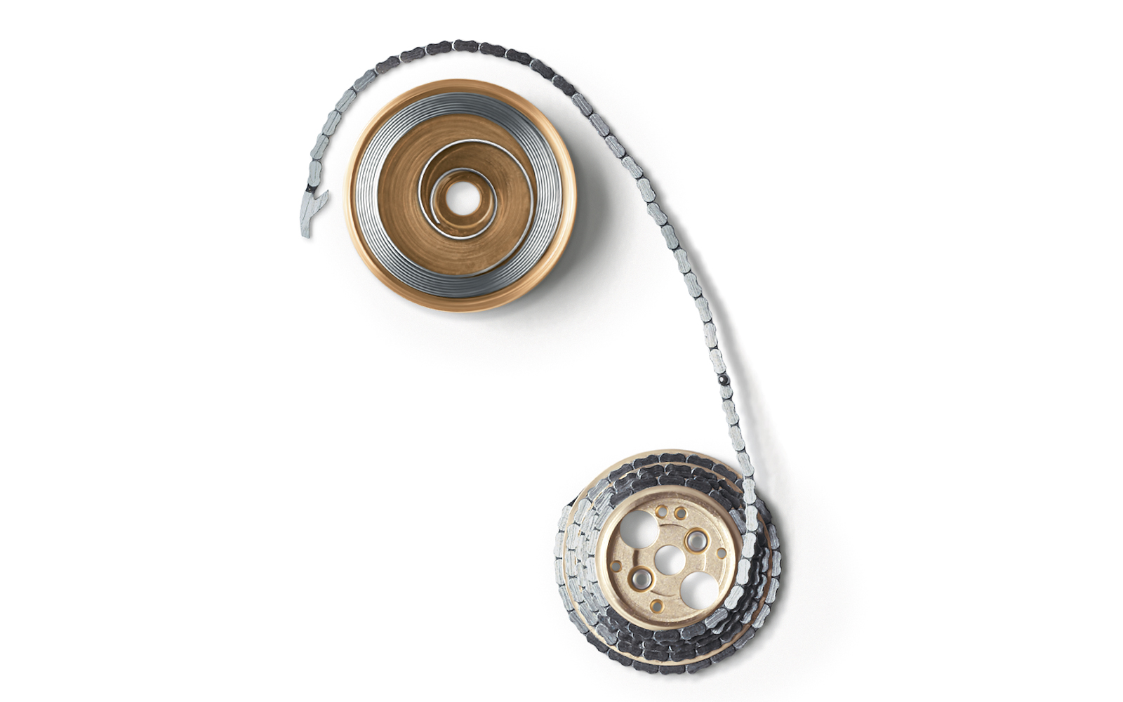 Now there have been many different solutions to optimize the power coming from the mainspring. One is the fusée and chain. Here, the barrel is connected to a cone‑shaped pulley called a fusée that gradually increases in diameter from one end to the other. The barrel and the fusée are connected by a tiny chain, which is truly a work of micro‑ mechanical artistry of the highest order. As the mainspring unwinds, the chain moves along the helical grooves on the fusée, which guide it from the narrow end to the wide end, changing the effective radius at which force from the mainspring is transmitted. When the mainspring is fully wound and strongest, the chain pulls at the narrowest part of the fusée, providing less mechanical advantage. As the spring weakens, the chain moves to the widest part, increasing leverage. This compensates for the dropping torque and creates a more stable and even power supply.