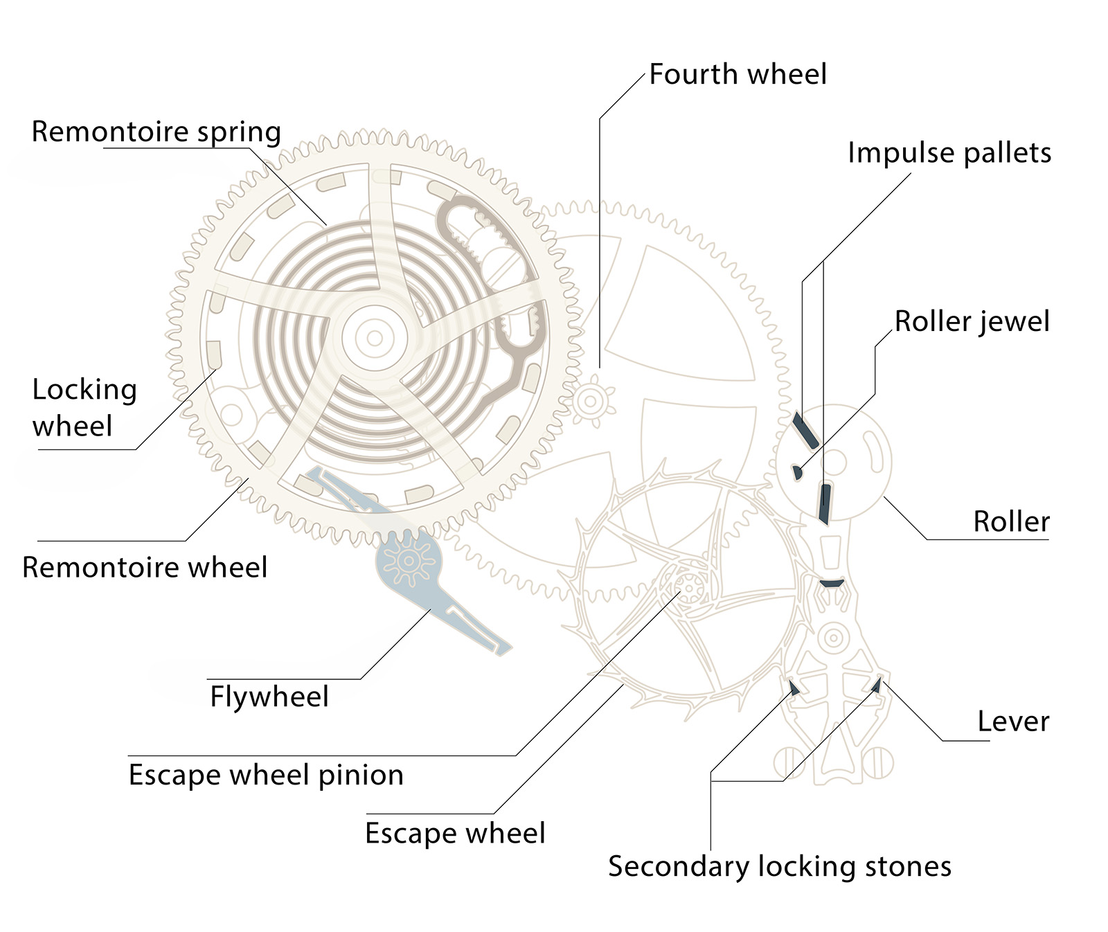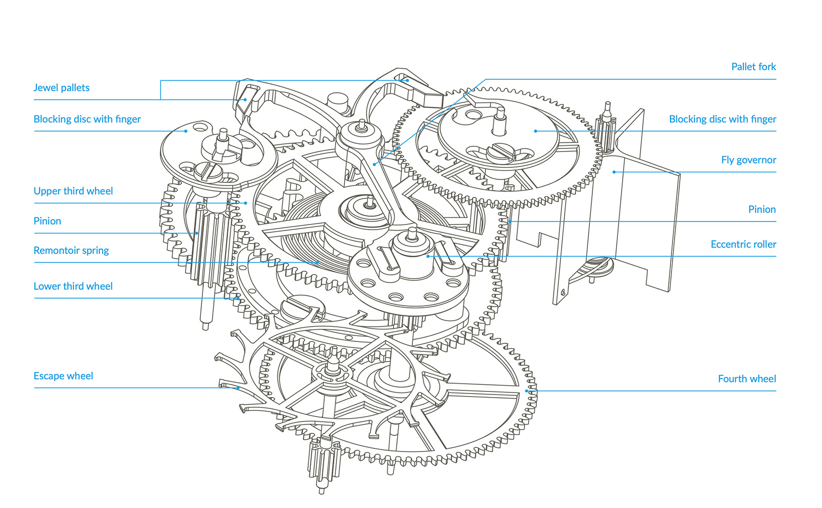 The remontoir spring is mounted on the fixed fourth wheel, physically positioned beneath the tourbillon cage. The third wheel in the going train powers both the cage pinion and a remontoir train that is unlocked by the tourbillon cage itself. The lower cage of the tourbillon is designed with four evenly spaced protrusions, one every 90 degrees. Each protrusion carries a small pin. As the tourbillon cage rotates, completing one revolution every 60 seconds, each pin trips a pallet jewel on the tip of a lever once every 15 seconds.