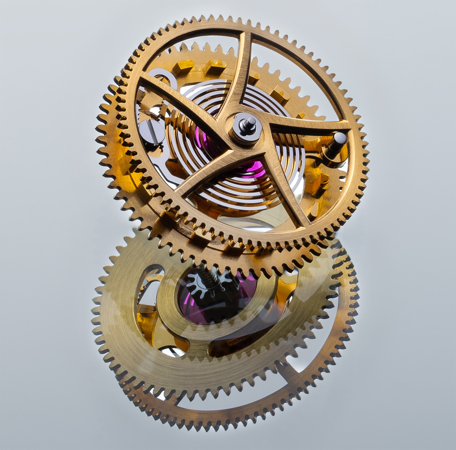 The control wheel triggers the unlocking and rewinding of the remontoir spring every 15 seconds, while the stop wheel immediately locks the remontoir train again, ensuring that the rewound spring delivers a steady force to the escapement until the next cycle.