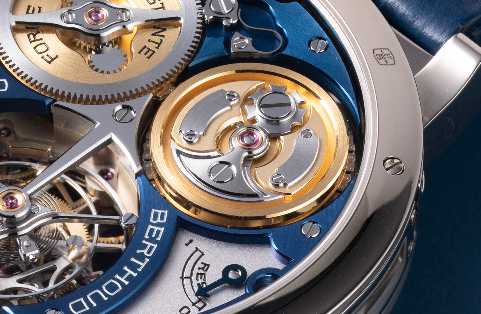The Caliber 1403 in F.P. Journe’s second-generation Tourbillon Souverain (TN) has a cut-out on the bridge that showcases the entire remontoire mechanism which relies on a blade spring