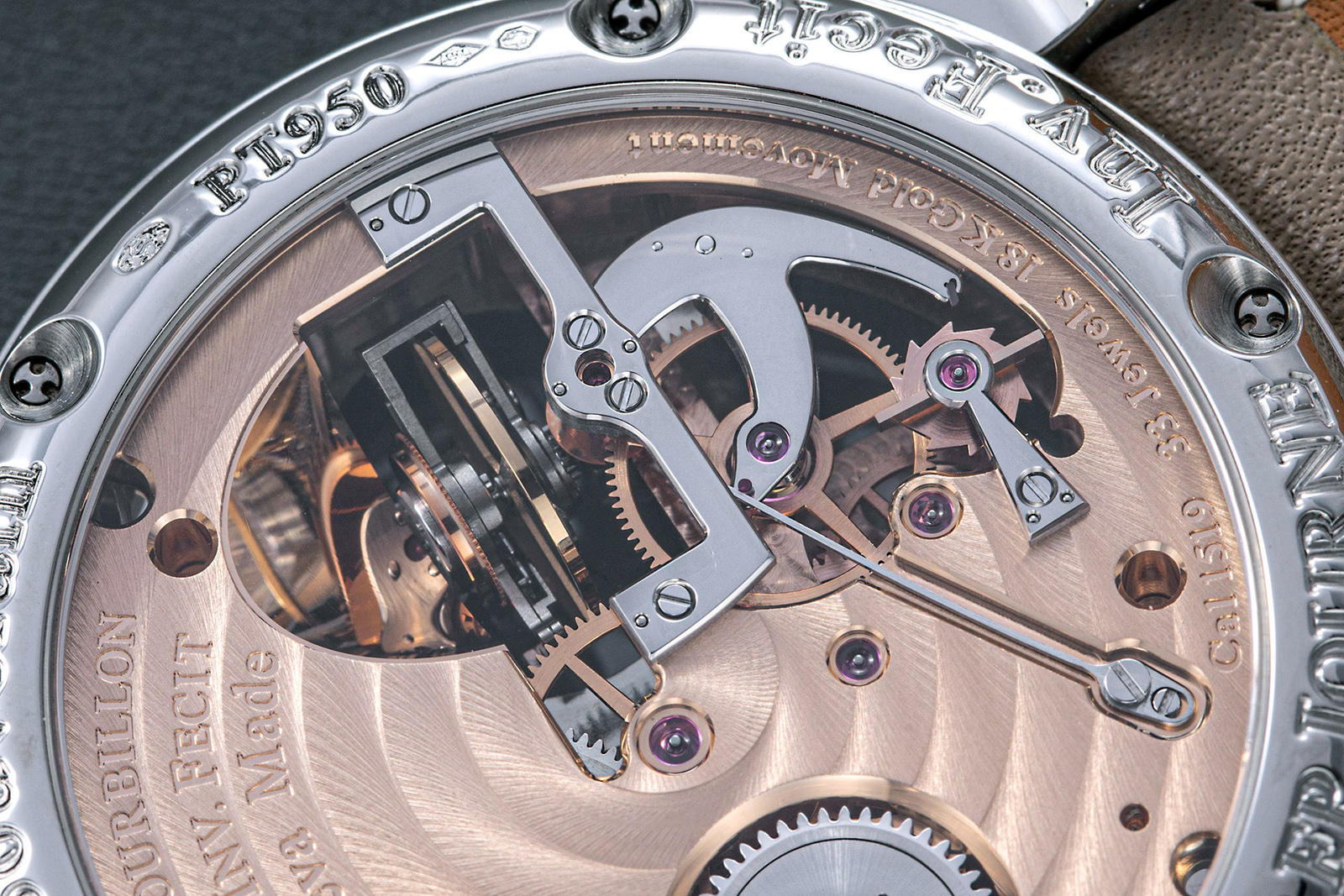 Strehler’s watch has a very interesting construction. Instead of placing the remontoir to the side of the tourbillon, it places it underneath the tourbillon, meaning that power comes from the watch’s two mainsprings to a large gold drive wheel known as the “petite moyen,” or intermediate wheel, which powers the pinion of the remontoir assembly — more specifically, the pinion of the satellite arm and wheel, which is the only element that is under the direct influence of the mainspring.