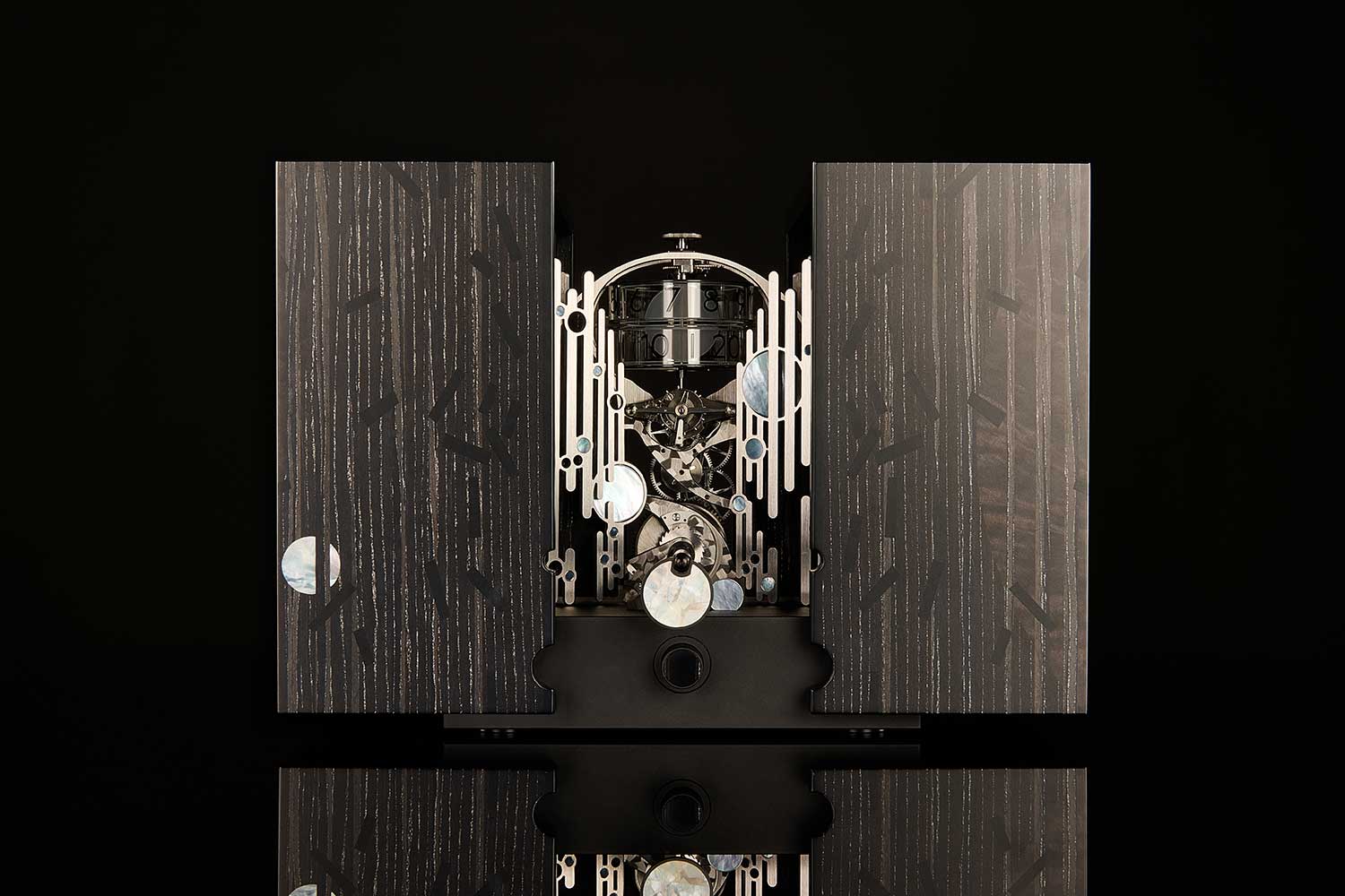 Externally, the piece takes the form of a closed rectangular box measuring 192mm in length. The surface is clad in movable mother-of-pearl disks crafted by Hawthorne Fine Boxes and artisan Emeline Dépail. A suspended mother-of-pearl key allows the movement to be wound, activating a ticking sound. But the case remains inert and mysterious until a hidden pusher is pressed.