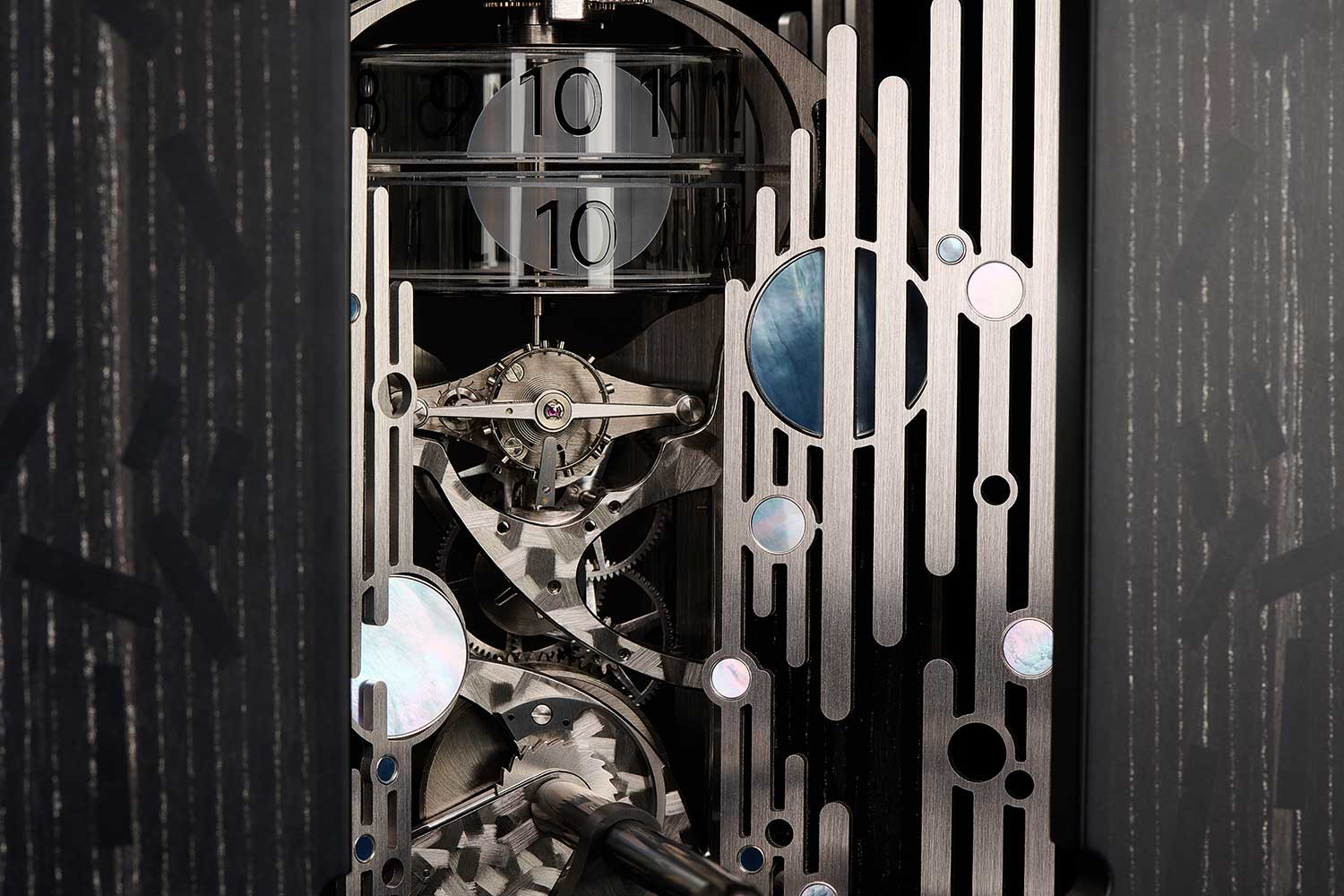 Drawing on the form of historic prism-shaped officers’ clocks – sometimes compared to roadside mileage markers – Flageollet has adapted the idea into a tabletop piece. Closing the case winds the motor spring; opening it releases the stored energy, with cams and eccentrics choreographing the movement of the outer discs. The mechanism appears simple, but Flageollet is quick to point out that its refinement depended on the work of a vast team of specialists and artists.