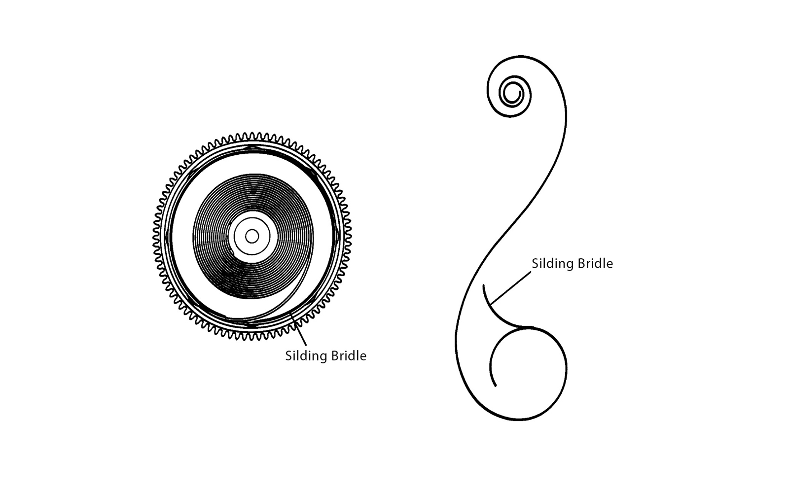 This contrasts with an automatic mainspring. The splayed end discussed earlier is curled back on itself when mounted inside the mainspring barrel. This gives the spring a strong grip on the barrel wall, meaning it does not require a hook or catch point. The force of this grip allows the spring to be wound to its maximum tension. If any additional energy is wound into the mainspring, the bridle loses its grip, and the spring slips around the barrel wall until the force evens out and the grip is reestablished.