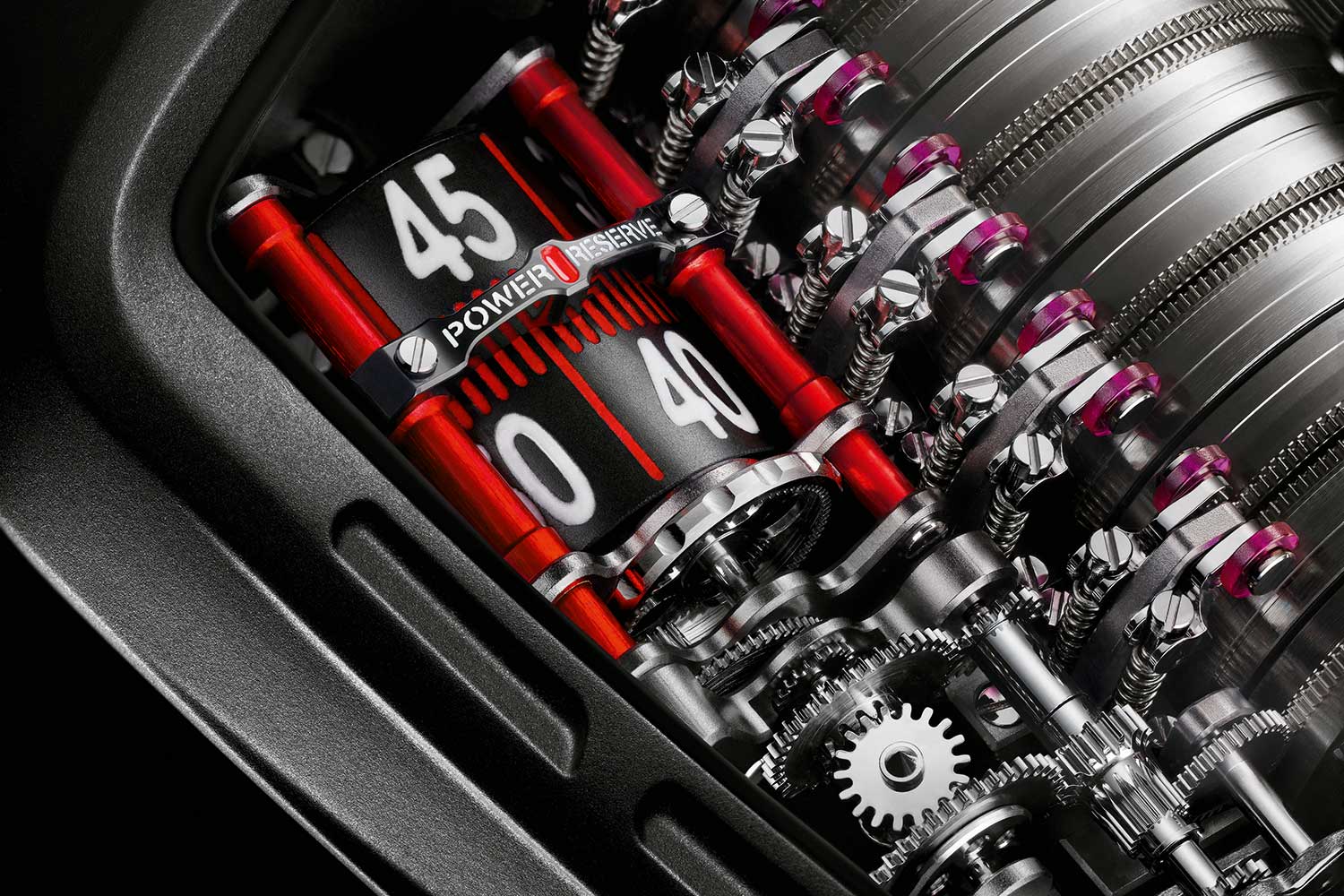 Where the MP-05 broke the case to accommodate its mechanics, the MP-11 folds the mechanics back into the case. The seven barrels form a straight horizon at the bottom of the dial, ending with a roller-based power reserve indicator while the gear train, balance wheel and time display occupy the upper half of the dial. The transition from the vertical to the horizontal plane is made possible by the helical toothing on the final barrel drum, which mesh with an intermediate wheel in the gear train cut with complementary slanted teeth.