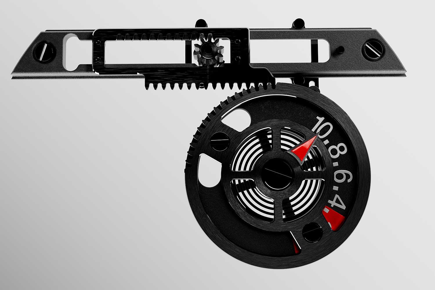 Finally, the regulator was also redesigned with a toothed circular sector integrated directly into the arm. Fine adjustment is made by turning a screw that drives a pinion engaging this toothed arc. At the root of the teeth lies a flexible structure that maintains constant contact between the meshing flanks, eliminating play. This ensures smooth and precise regulation in either direction, while also making the mechanism easier for watchmakers to access and adjust.