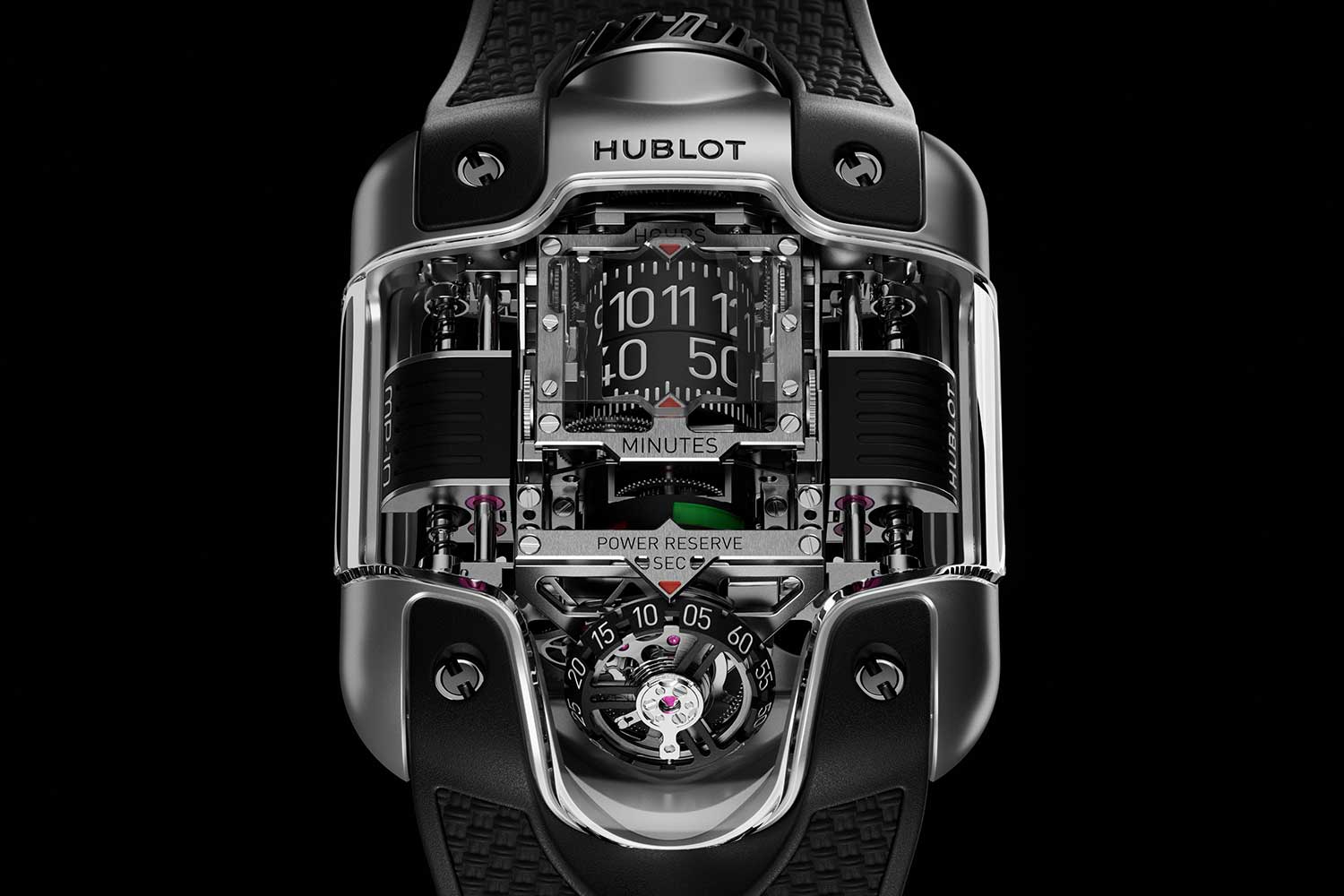 Beyond its mechanical ingenuity, the linear winding system offers an architectural advantage. It can be integrated into non-orthogonal movement layouts where a traditional rotor would be obstructive. In the MP-10, this freedom is used to full effect. The twin linear weights flank the hours and minutes displayed on aluminum rollers, alongside a circular power reserve indicator, while the tourbillon and seconds display are set on an incline.