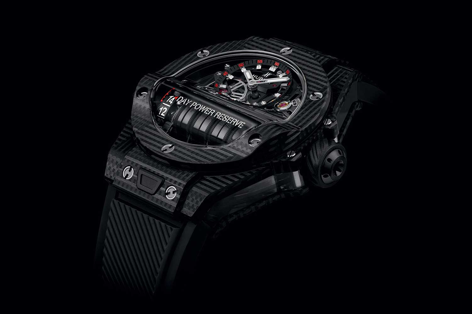 The MP-05 LaFerrari with stack of mainspring barrels aligned vertically along the central axis of the watch (©Revolution)