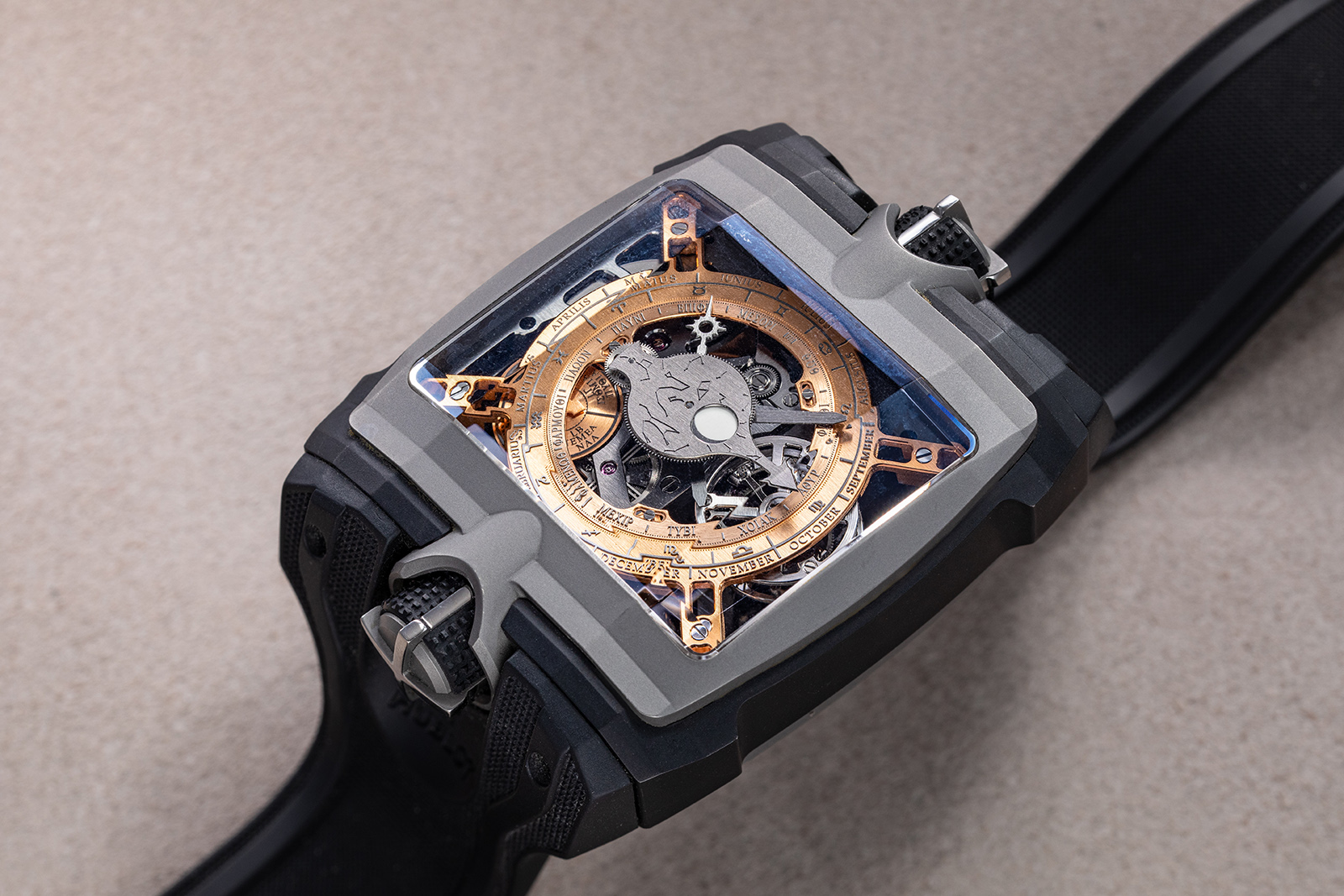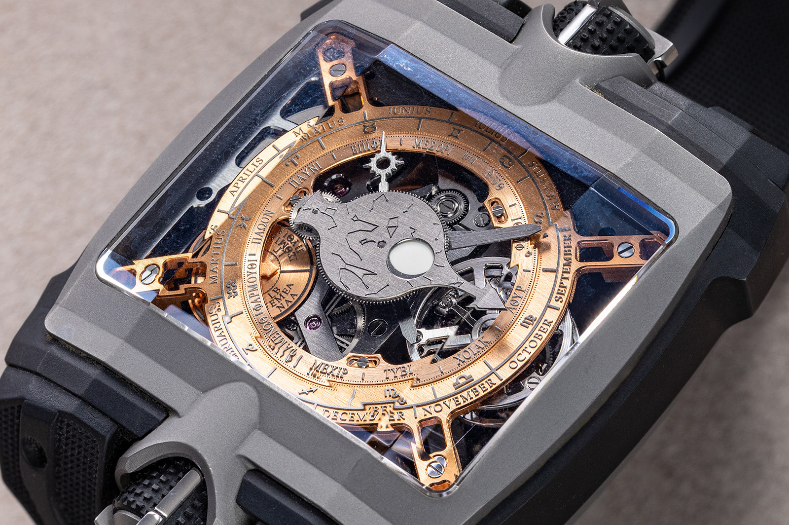At its core, the Tribute to the Antikythera Mechanism was built around a conventional timekeeping organ — a one-minute tourbillon — which regulated a vast array of astronomical indications derived from the original device. On the front, the dial displayed a wealth of information: the Egyptian 365-day calendar with its epagomenal days, the Panhellenic games calendar including the Olympic Games, the position of the Sun within the zodiac, and the age and phase of the Moon. A large aperture traced the Moon’s progress through the constellations, accounting for the slight variations in its orbit through a differential system inspired by the ancient model.
