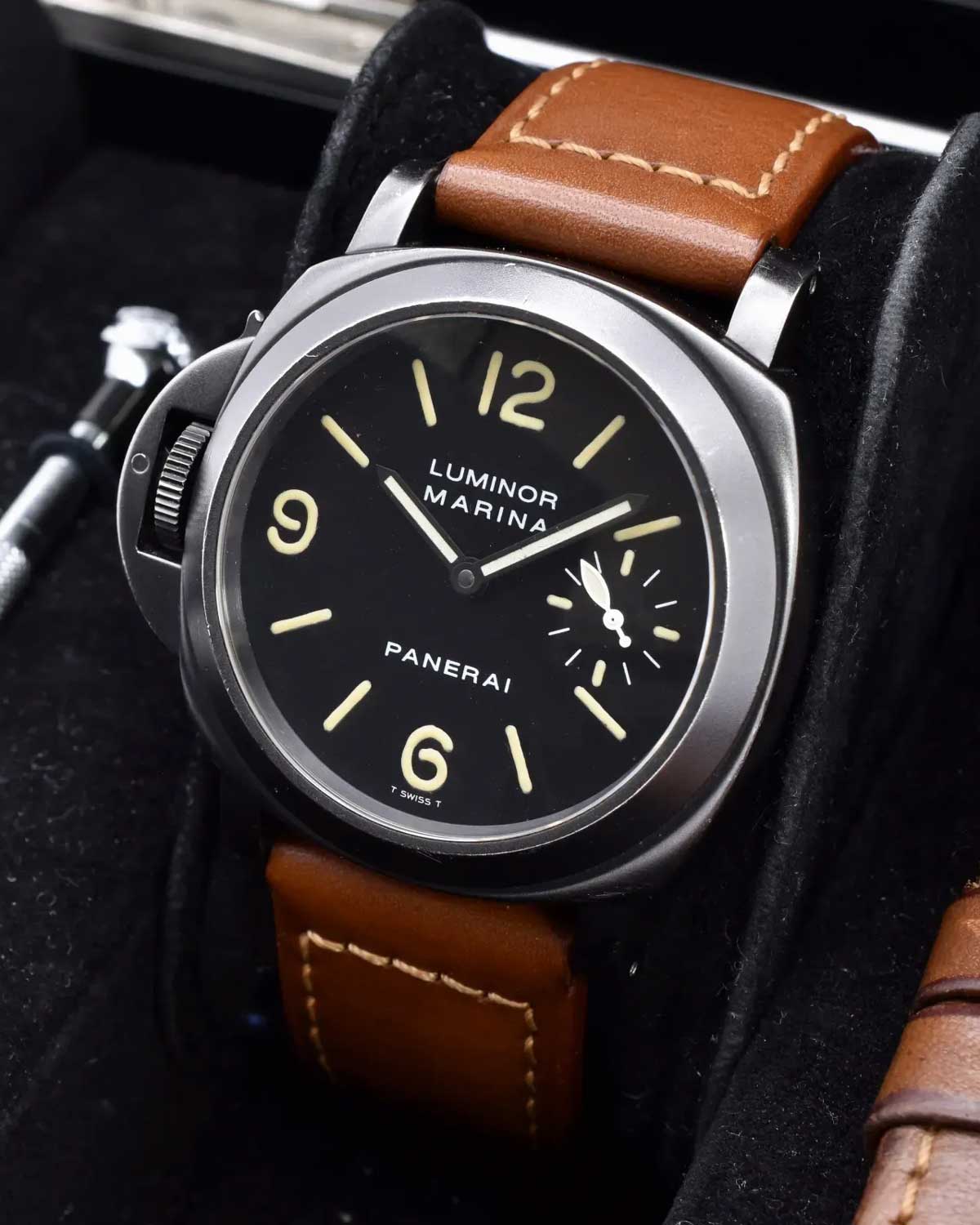 The distinct PAM00036 watch with titanium case and tobacco-brown dial appeared in the 1998 catalog in all its transcendent glory. Yet somehow, the watches weren’t released until 1999, which explains why they were engraved with a “B” serial number, corresponding with that year. A popular theory is that Bonati intended the PAM00036 as part of the first salvo of watches. Giving credence to this is the fact that the luminous indexes of the PAM00036 are tritium. Tritium was used for all “A” series dials; however, because of changes in Swiss law, by the “B” series the following year, all Panerai dials (with the exception of its professional certified diving watches and special edition PAM00040) would feature Luminova indexes. This would lead us to believe that the dial of the PAM00036 could have been manufactured in 1998, along with all other A-series tritium dials.