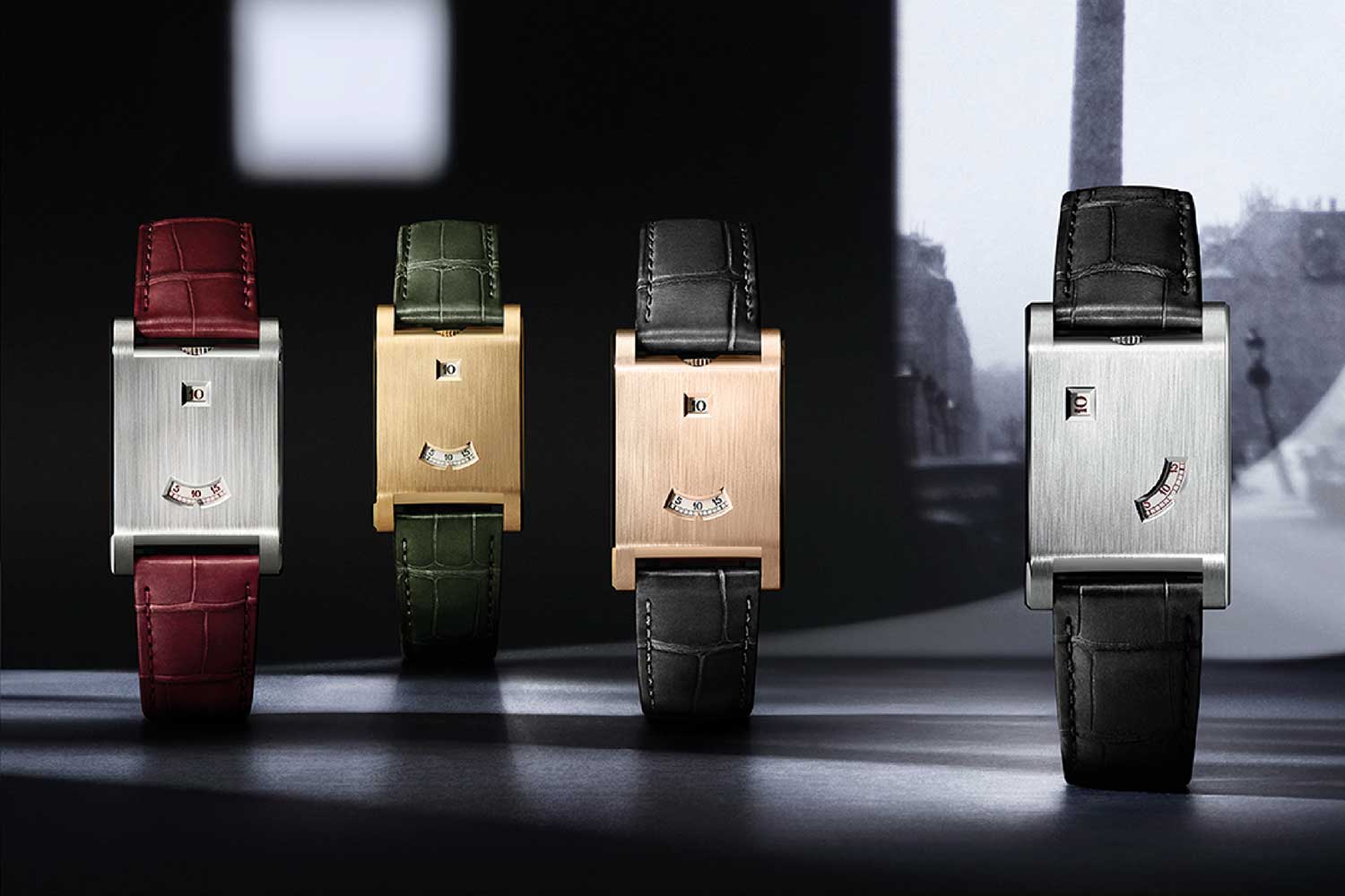The 2025 collection explores this architecture in four editions, split across two dial layouts. The first three show hours in a square aperture at 12, minutes in a curved window at six, just as they were on the first Tank à Guichets. Collectors can acquire this configuration in yellow gold on a dark green alligator strap, with matching green numerals on the discs; in rose gold with grey numerals and a charcoal strap; or in platinum, whose brushed coolness is offset by burgundy printing and a rich red strap. In each case, the colour is echoed in the typography and leather; single-colour metal enhanced by a careful colour pairing.