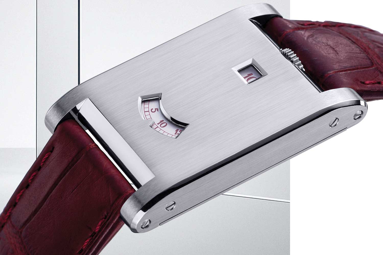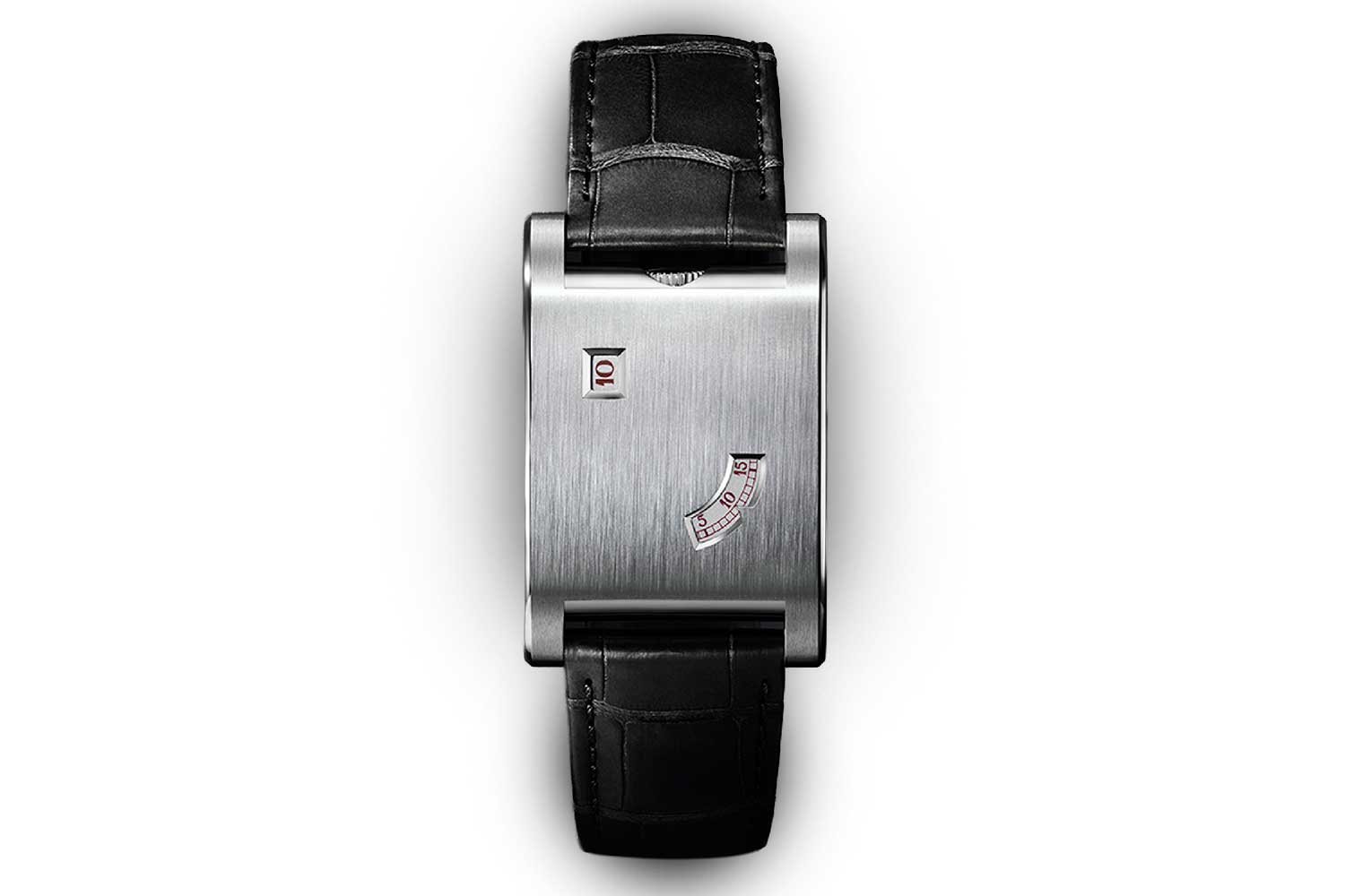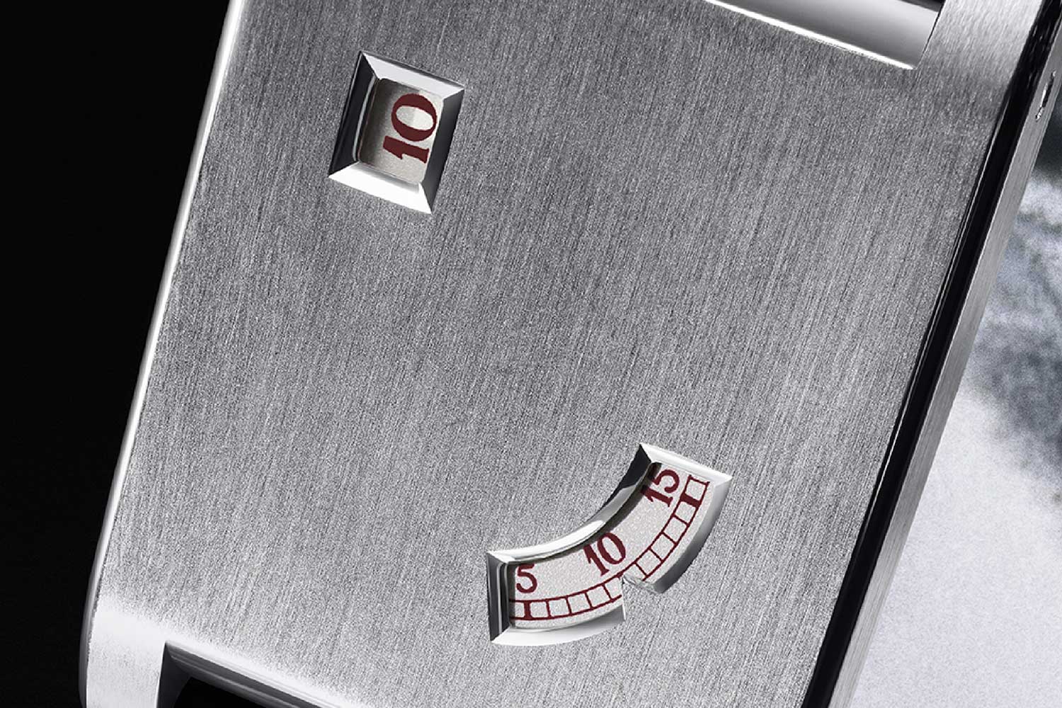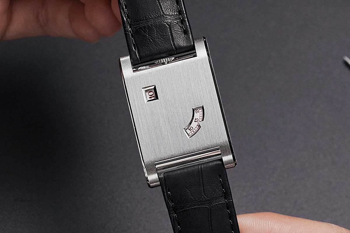 If all this sounds quite conceptual, the reality is that the new Tank à Guichets is really wearable. The dimensions are compact by modern standards, and the slim profile means it slides under a cuff with barely a ripple. On the wrist, it feels dense but not ostentatious. The brushed case front keeps reflections to a soft glow, so what you notice is not bling but the rectangular form and the way the flanks of metal run from strap to strap, as well as the precise framing of the two apertures and of course that impeccable, brushed finish.
