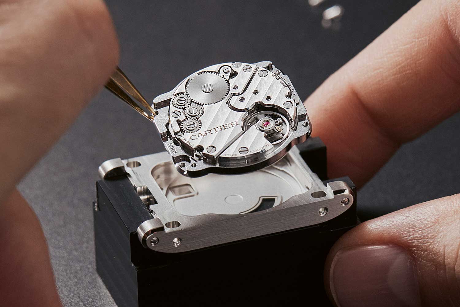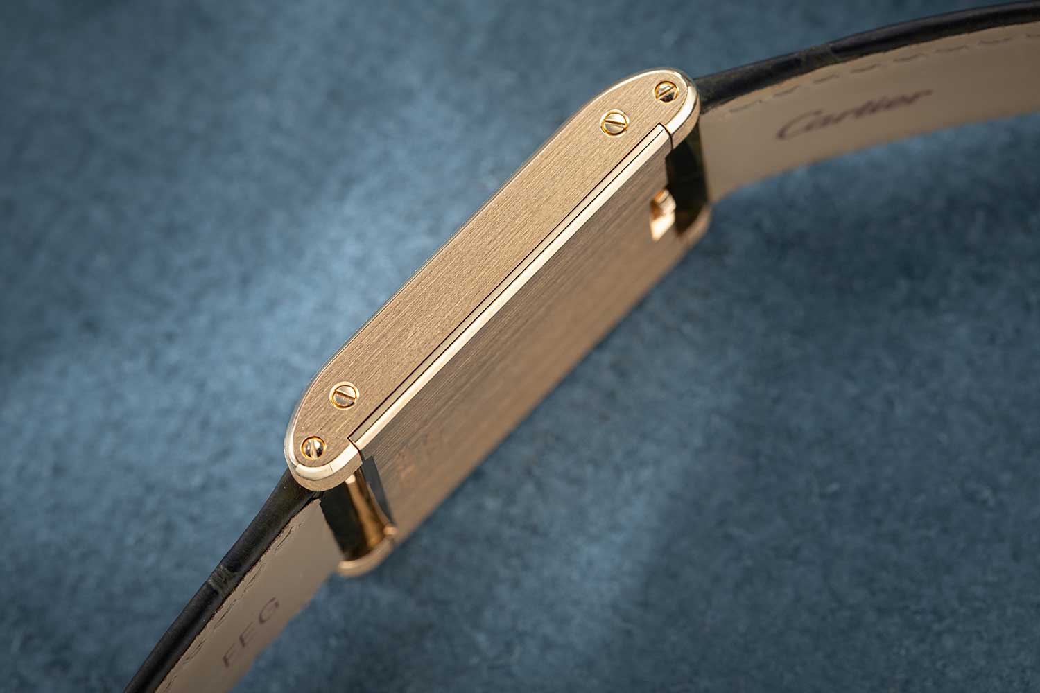 The crown — a tiny beaded cylinder with the signature Cartier cabochon – has moved from its usual position at three to sit flush at 12 o’clock, echoing certain historic pieces and keeping the silhouette even more clean with a flatter appearance. The flat face of the watch has been meticulously vertically satin-brushed, while the horizontal edges catch the light with an impeccably polished gleam. The edges of the tiny windows have been carefuly hand-polished as they are too introcate to be machined by hand.